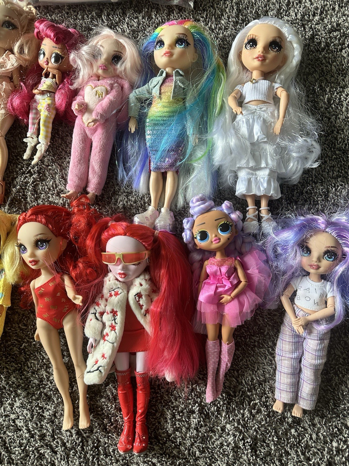 The product is a lot of 12 Rainbow High dolls and accessories, along with 2 LOL dolls. The set includes 14 pieces in total. This lot offers a variety of dolls and accessories from the Rainbow High brand, providing a diverse selection for young fans of the franchise.