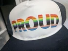 Proud rainbow trucker snap back hat.
