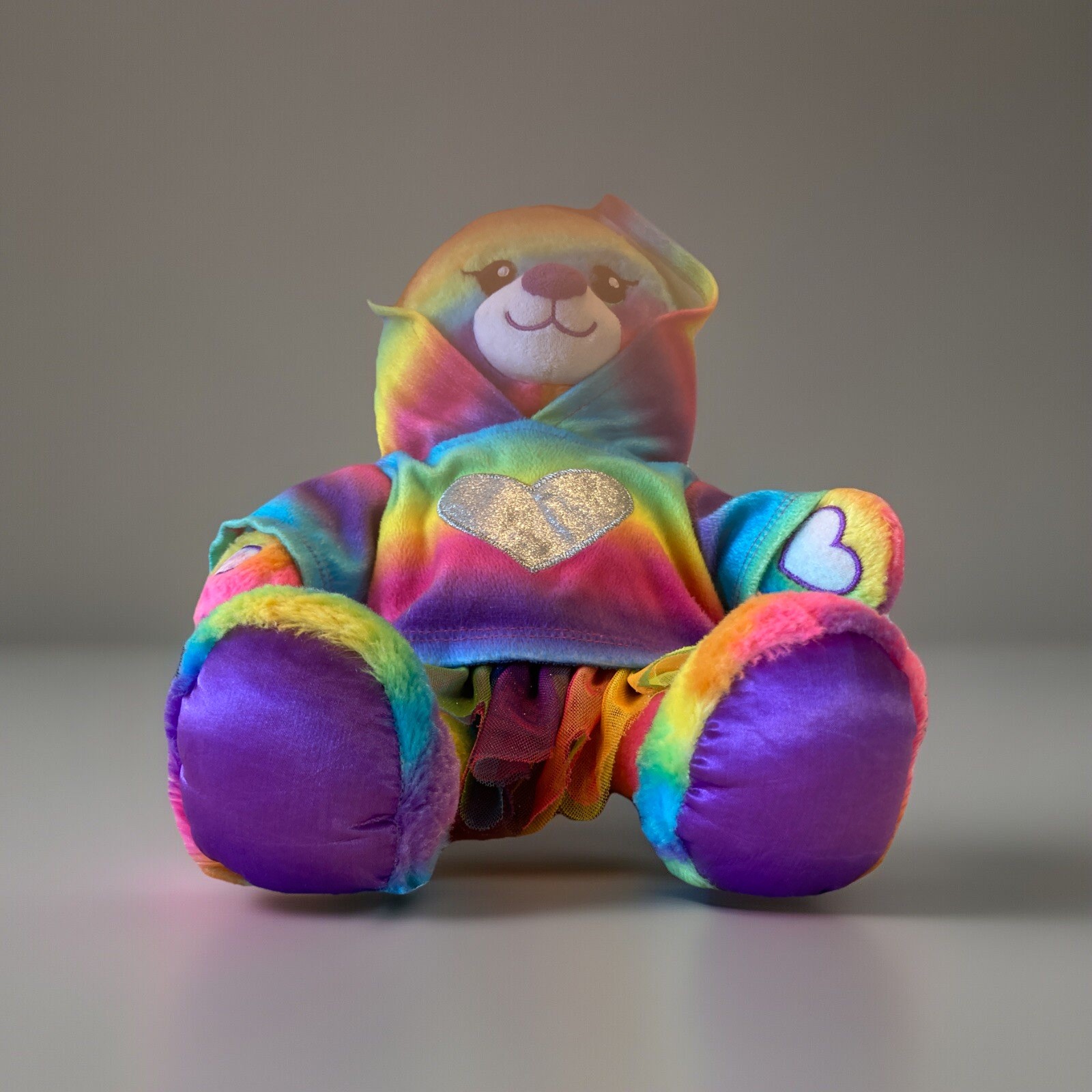 Dress up your Build-A-Bear Workshop creation with this vibrant Rainbow Tie Dye Stripes Plush outfit, complete with a tutu and a silver heart hooded shirt. The 17-inch bear-sized costume is perfect for any occasion, whether it's a playdate or a party, capturing the spirit of fun and friendship that Build-A-Bear is known for. Crafted with care, this multi-colored ensemble ensures your bear stands out in any collection, embodying the playful essence of the franchise. The set includes everything your bear needs to look its best, all designed to fit perfectly with any Build-A-Bear Workshop plush. BAB0320