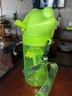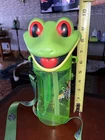 The Rainforest Cafe Green Tree Frog Souvenir Cup is a large, round, green plastic cup featuring a forest pattern with a rainforest frog theme. It is designed as a travel mug for cold beverages, with a lanyard for easy carrying. The cup includes a handle and straw for added convenience. Made by the Rainforest Cafe brand in China, this souvenir cup is a unique and fun item for fans of rainforest animals and frogs. Care instructions recommend hand washing only. Comes from a clean smokefree home. No holes, cracks or Knicks