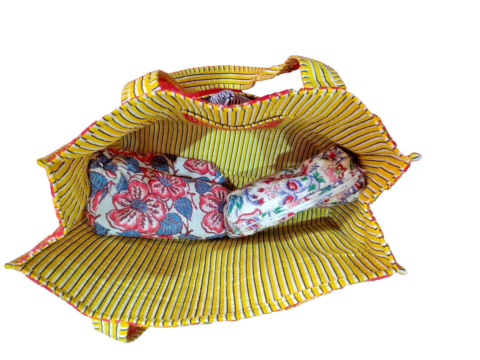 Crafted with meticulous attention to detail, this Rajasthani Handmade Tote Bag is a unique blend of functionality and artisanal charm. It features a vibrant red exterior, complemented by a contrasting yellow lining, creating a striking color combination. The bag measures 18 inches in width, 17 inches in height, and 6 inches in depth, providing ample space for your daily essentials. The tote is designed with a rectangular shape and a comfortable cotton fabric handle, ensuring it's lightweight and easy to carry. Its hand-block printed pattern adds a touch of traditional Indian craftsmanship, while the quilted finish and additional unbranded handle enhance its aesthetic appeal. Ideal for a variety of occasions, from casual outings to business meetings, this versatile tote is a testament to classic design and enduring style. ***Note:- "International buyers are responsible for their countries duties and taxes"