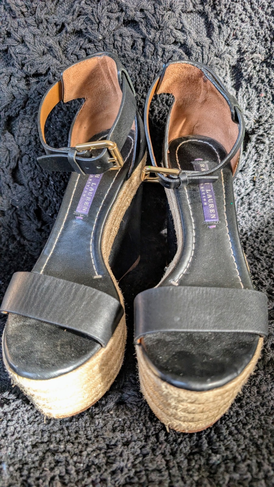 Elevate your style with these stunning Ralph Lauren Collection, made in Spain, black strappy sandals. The 5" wedge heel provides an ultra-high lift, while the adjustable strap and buckle closure ensure a comfortable and secure fit. These versatile sandals are perfect for any occasion, from a wedding to workwear. Crafted from high-quality leather and rubber, these sandals are both durable and stylish. The solid black color and strappy design make them a timeless addition to any wardrobe. Whether you're dressing up for a formal event or keeping it casual for a day out, these sandals are the perfect choice.