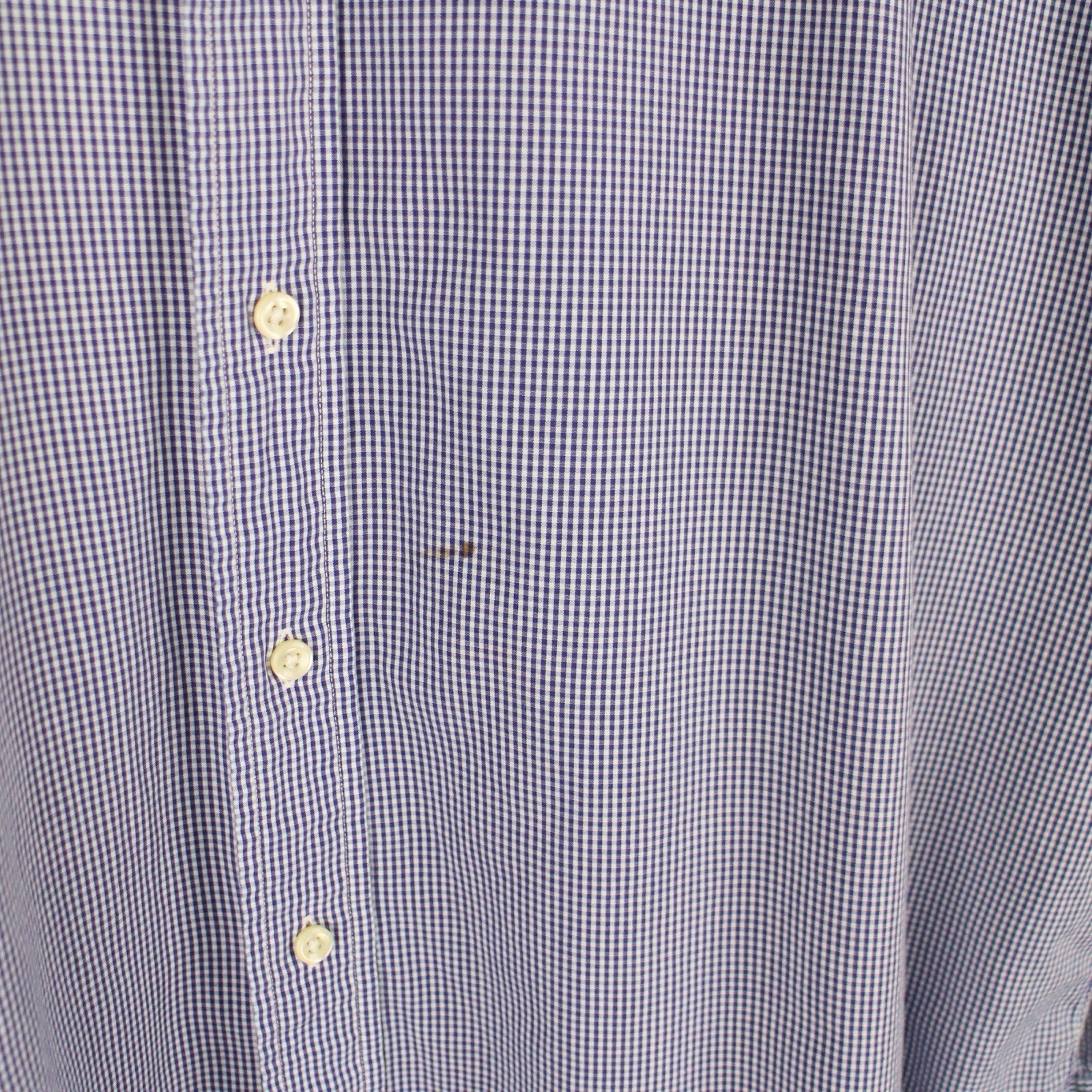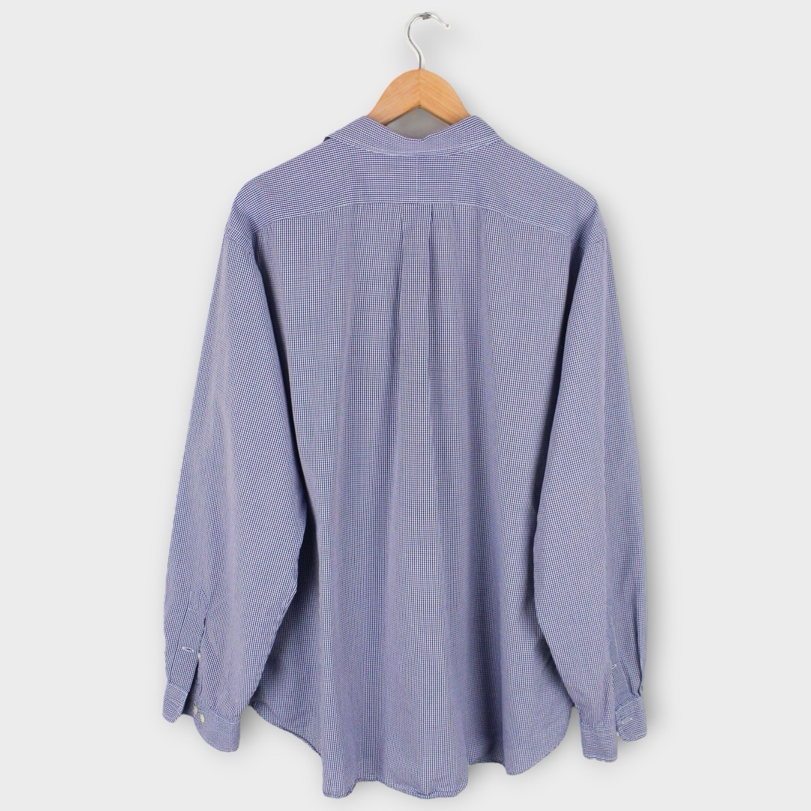 Timeless Ralph Lauren men’s button-down shirt in a blue and white micro-check pattern. Features the signature embroidered pony logo on the chest and a comfortable Classic Fit cut — perfect for both casual and business settings. Details: • Brand: Ralph Lauren • Size: 18 (Neck) / 36–37 (Sleeve) • Color: Blue & White Check • Material: 100% Cotton • Fit: Classic Fit • Features: • Button front • Button-down collar • Chest logo embroidery • Long sleeves with button cuffs • Made in Malaysia Condition: Good pre-owned condition — small faint mark on the front (see close-up photo). No holes or major flaws. ⸻ 📏 Measurements (approx.): • Pit to Pit: 29” • Length: 31” • Sleeve: 26”