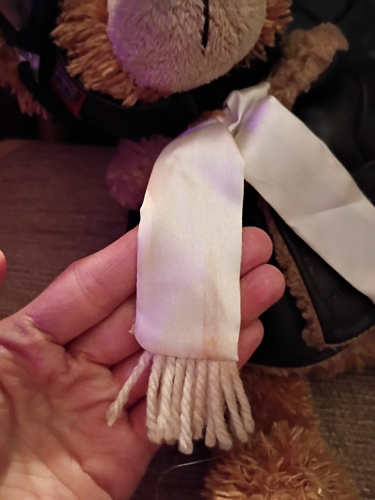 this guy has no tags but is in pretty good condition. his glasses have broke so I tied them back and there is some stains on the scarf.