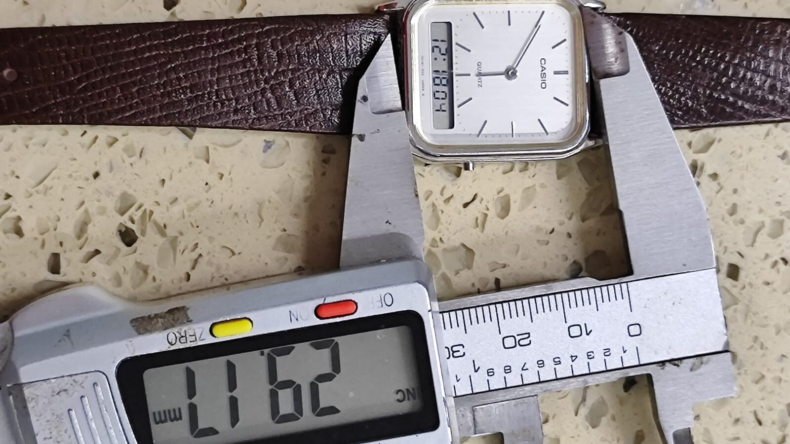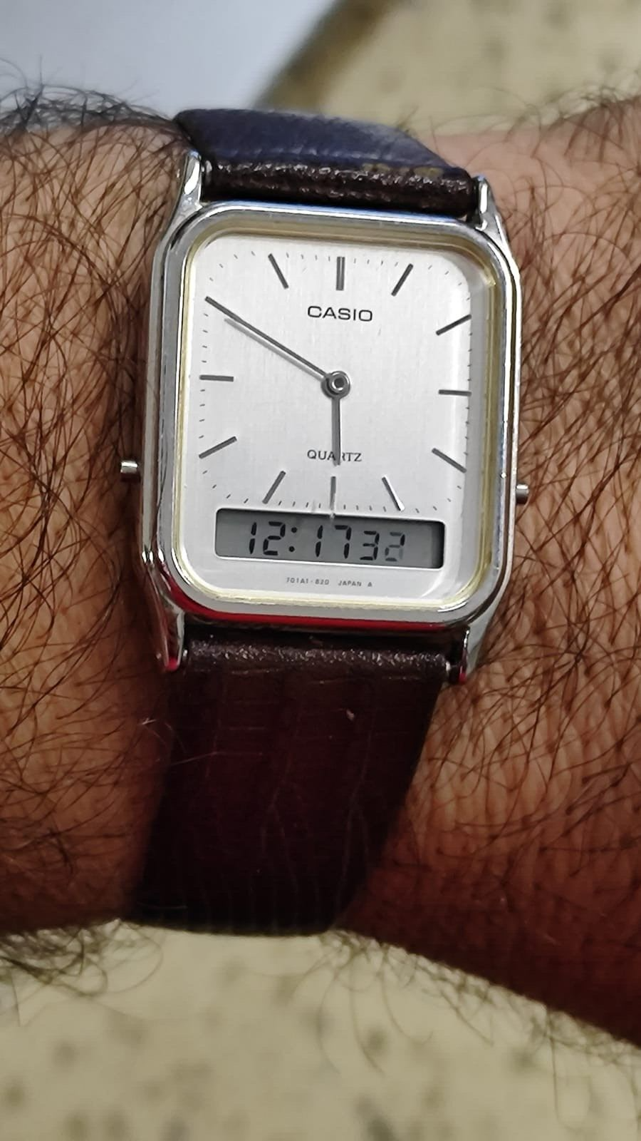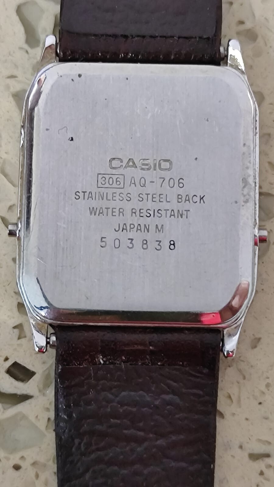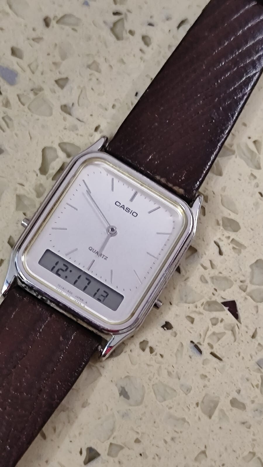 Please note: All battery operated watches will be shipped without a battery. Please note: All battery operated watches will be shipped without a battery. The Casio Vintage AQ-307 is a rare men's wristwatch from the 1990s, featuring a quartz movement and a unique analog/digital display. The watch has a slim design with a 29mm case size and a brown leather band. Made in Japan, this model is part of the Casio Vintage collection and is known by the reference number AQ307.