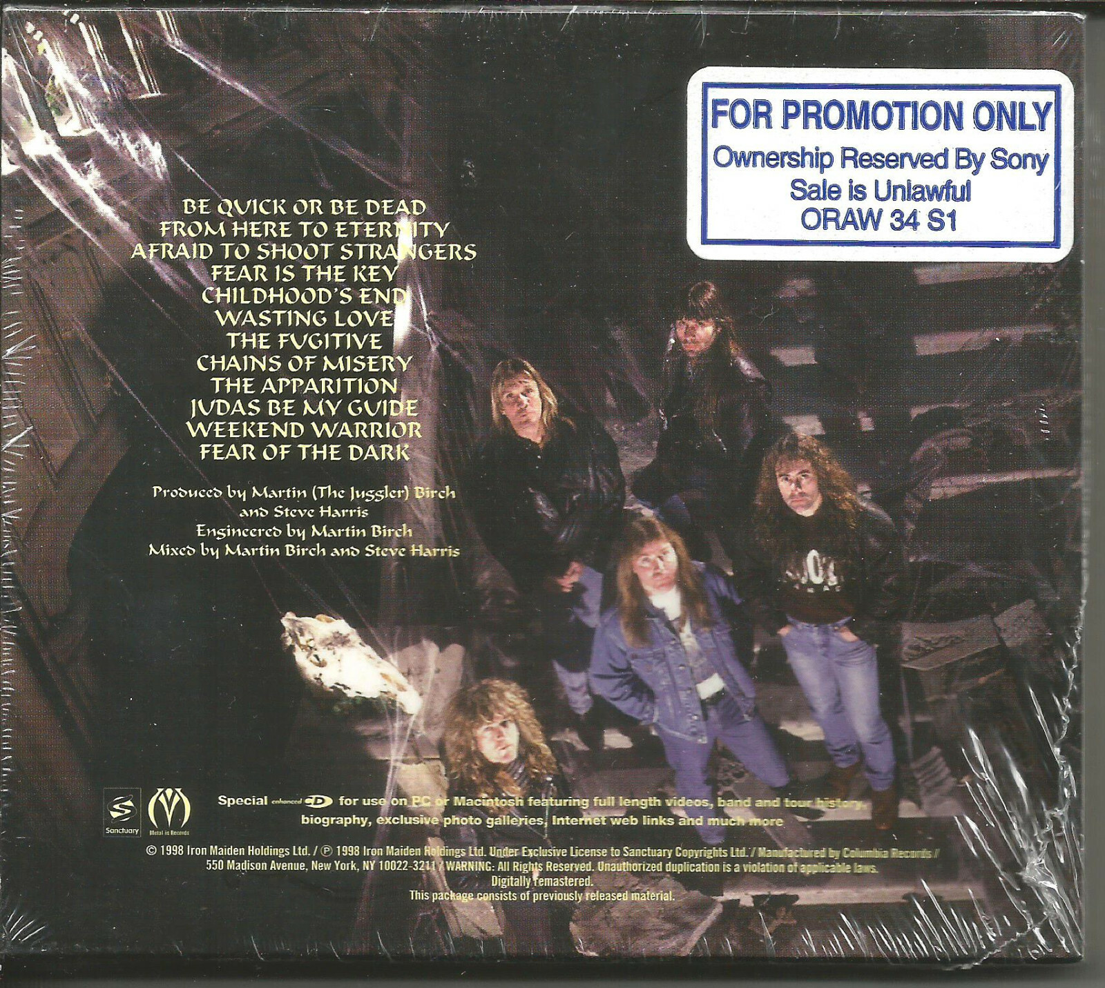 1998 STILL SEALED MINT CONDITION CD and NEAR MINT condition (there is probably a hole punch in the back cover bar code ( I have others listed that have one but this is sealed so I don’t know for sure) BUT STILL EXTREMELY NICE SEE SCAN FOR ACTUAL ITEM, and the CD ITSELF IS MINT THIS IS THE 1998 PRESSING OF THE CD IT INCLUDES THE PROMOTIONAL WORDING STICKER OVER THE ACTUAL BACK BAR CODE OF THE SLIPCASE , WHICH WAS DONE IN EXTREMELY LIMITED QUANTITY AND WENT OUT TO PRESS AND SELECT MUSIC INDUSTRY PROFESSIONLS ONLY, THIS COMES IN A STANDARD JEWEL BOX WITH A CARDSTOCK PAPER SLIPCASE The track listing is: 1 Be Quick Or Be Dead 3:24 2 From Here To Eternity 3:38 3 Afraid To Shoot Strangers 6:56 4 Fear Is The Key 5:35 5 Childhood's End 4:40 6 Wasting Love 5:51 7 The Fugitive 4:54 8 Chains Of Misery 3:37 9 The Apparition 3:54 10 Judas Be My Guide 3:08 11 Weekend Warrior 5:39 12 Fear Of The Dark 7:16 Video1 Be Quick Or Be Dead Video2 From Here To Eternity Companies, etc. International shipping Available Any questions email me PLEASE SEE OUR OTHER ITEMS FOR OTHER RARE IRON MAIDEN & WE DO COMBINE SHIPPING Sale of this item is specifically allowed under the copyright laws of the United States {17 USC 109(a)} which states that "the owner of a particular copy or phonorecord lawfully made...is entitled, without the authority of the copyright owner, to sell or otherwise dispose of possession of the copy or phonorecord". THIS ITEM IS 100% OFFICIAL AND RELEASED BY THE RECORD LABEL, if you have any questions or concerns about this item please contact us and we can resolve any issue immediately