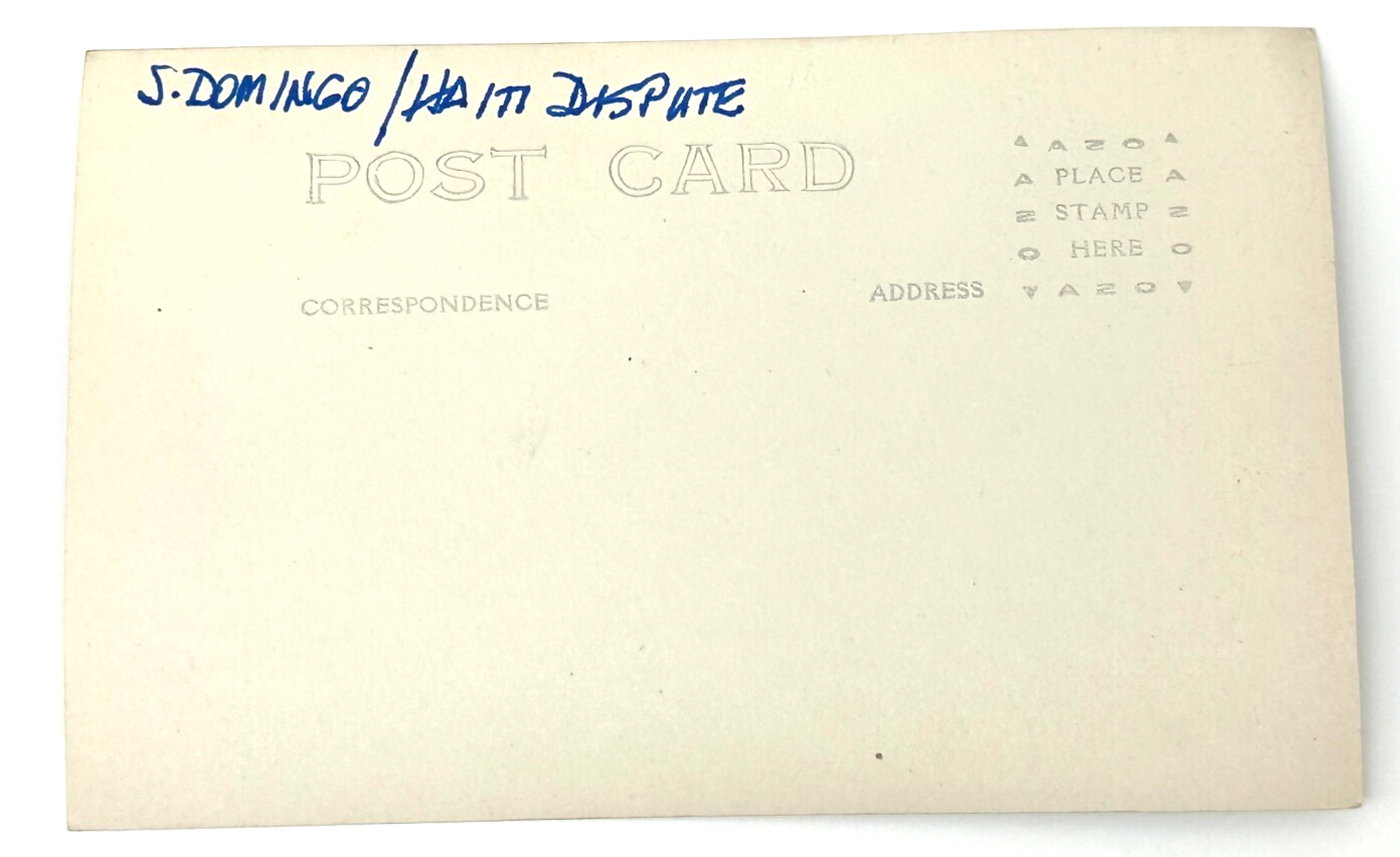 This striking real photo postcard documents U.S. troops stationed in the Caribbean during the early 20th century “S. Domingo / Haiti Dispute.” With a line of soldiers standing at attention under the American flag, this card offers a historically potent view of U.S. occupation forces in the region. A key find for military postcard collectors and those studying Caribbean intervention history.