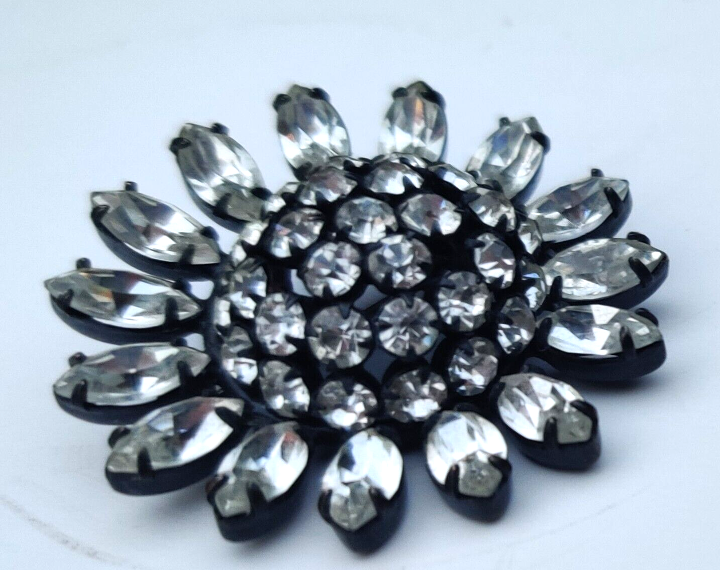 Rare Schreiner Crystal Brooch Verified Japaned Back 1.75" Domed All Rhinestones present and sparkle. No wear noted on black finish. Unsigned kj