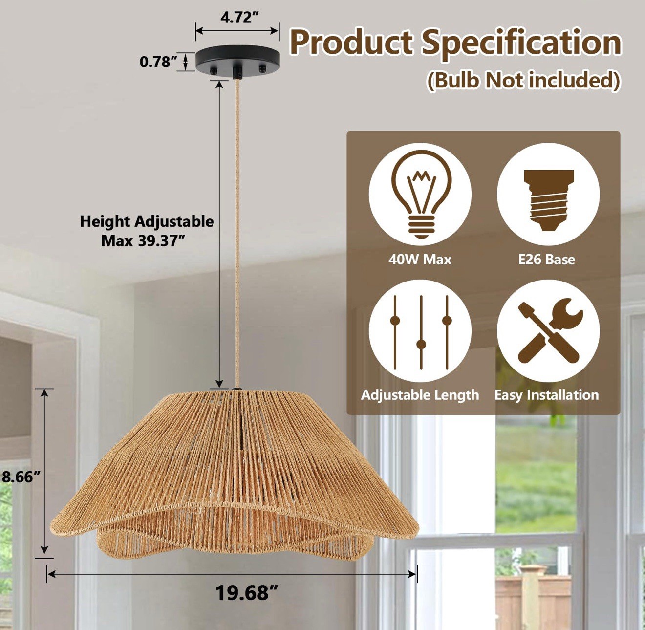 Unique 2-layer Rattan Design】The boho pendant lights kitchen island is made of the hand woven natural rattan and durable metal to be a bohemian look. The double irregular design casting petal-shaped shadows on the ceiling, adding a warm and inviting atmosphere. 【Large Dimension & Adjustable Cord】The rattan light fixtures ceiling hanging size:D 19.68" x H 8.66", Canopy: D 4.72x H 0.78", Max cord length : 39.37". So you can adjust it for use as a boho pendant light or boho ceiling light according to your own preferences and designs. 【Wide Applications】The 19.68 inch diameter wicker chandelier adds a natural touch to any space and is perfect for hanging in dining rooms, living rooms, bedrooms, kitchen islands, bathrooms, stairway, hallway, foyers, laundry rooms, offices, and other areas, being the highlight of the house. 【Bulbs Type】The rattan lamps needs 3 x E26 base Max 40W per bulb(not included). Support Led, incandescent, halogen, Edison bulbs, etc. It is fully dimmable when applied with dimmer switch and dimmable bulb (switch and bulb not included). 【Easy to Install 】 The coastal chandelier is ul certified and all accessories and instructions are included for your quick installation.