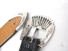 Ray Tracey Navajo Signed Sterling Silver 14K Gold Leather 32”Belt Ranger Buckle Ray Tracey Navajo Signed Sterling Silver 14K Gold Leather 32”Belt Ranger Buckle This gorgeous belt is in GREAT condition with NO damage. Buckle holes show no kink from use. Backside of the leather is signed. Buckle ends are stamped STERLING with the Knifewing hallmark by Ray Tracey. The belt length adjusts for 29-1/2” to 33”. Check out the super-sized pics for a complete look. See our other auctions for MORE VINTAGE and FINE JEWELRY and $ave on combined shipping! Enjoy Shipping to US ONLY We at The Blue Sage Merchant truly value your business. We strive for 5 -STAR FEEDBACK and want you to be 100% satisfied with your item. Let us know if YOU HAVE ANY ISSUES before leaving less than a 5-Star DSR score (Detailed Seller Rating) And we will do our best to MAKE IT RIGHT ! May the Peace of Jesus Christ be with you always! GOOD LUCK BIDDING!!! Shipping to US ONLY. Click the 'SHIPPING & PAYMENT' tab TO GET EXACT SHIPPING TO YOU. For merchandise not being mailed to the winning bidder, but rather picked up at our retail store there is NO shipping charge. Immediate payment is preferred. Please NOTE: Import duties, taxes and charges are not included in the item price or shipping charges. These charges are the buyer's responsibility. These charges are collected by eBay when you are checking out after winning an auction. Listing and template services provided by inkFrog
