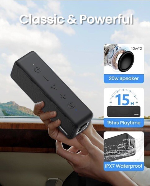 Raymate Bluetooth Speakers, 20W IPX7 Waterproof Speaker Wireless Bluetooth-V5.0 NEW Introducing the ultimate Wireless Bluetooth Speaker - a top-of-the-line device designed for music enthusiasts. Featuring Bluetooth Speakers with a powerful 20W output and IPX7 Waterproof design, this speaker ensures you can enjoy your favorite tunes anywhere, anytime. With the latest Bluetooth V5.0 technology, you can easily connect your devices for a seamless listening experience. Features: Hi-Fi Stereo Sound & TWS Pairing : Experience exceptional 360° Hi-Fi stereo sound with the Raymat R5 bluetooth speaker, delivering a total output of 20W and built-in microphone. Advanced audio processing and dual-driver technology provide rich bass and crisp treble. You can also pair two bluetooth speakers using the TWS function to create an immersive sound experience. Wireless Bluetooth 5.0 : Raymat R5 bluetooth speaker features advanced bluetooth 5.0 technology, allowing wireless connections to devices within a range of up to 66 feet. Easily connect to your music playlist and pair with a variety of devices, including smartphones, laptops, and MP3 players. Whether you're out for an adventure or relaxing at home, this speaker ensuring a wireless audio experience. IPX7 Waterproof : With an IPX7 waterproof rating, this portable bluetooth speaker is built to withstand rain, dust, snow, and spills, and can even be submerged in water for extended periods. It’s the ultimate companion for pool parties, beach barbecues, biking, hiking, camping, and more, ensuring you can enjoy music anywhere, everytime. Impressive Battery Life : Equipped with a powerful 3600mAh battery and Type-C fast charging, this portable bluetooth speaker fully charges in under 3 hours. Enjoy up to 15 hours of continuous playback on a single charge, giving you the endurance needed for outdoor adventures or all-day events. Portable Speakers : Designed for ultimate portability, this compact and lightweight bluetooth speaker comes with a 3.5mm AUX input and a Type-C charging port with a user manual, easy to use. A built-in hook and carabiner make it easy to attach the speaker to your backpack, bike, or any favorite spot, making it a perfect companion for outdoor activities like hiking, camping, and biking. Package Includes: Speaker