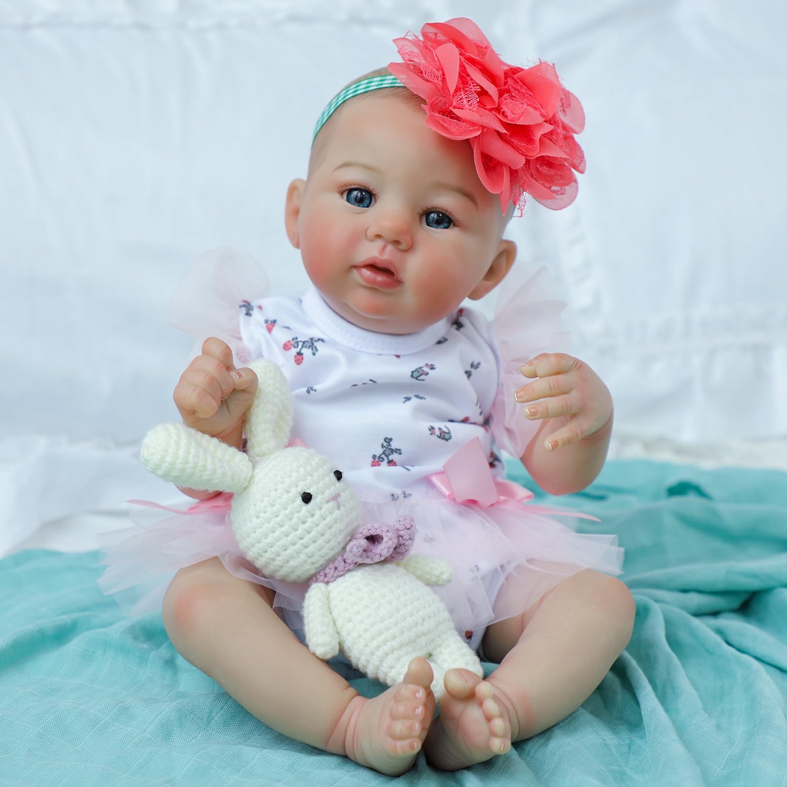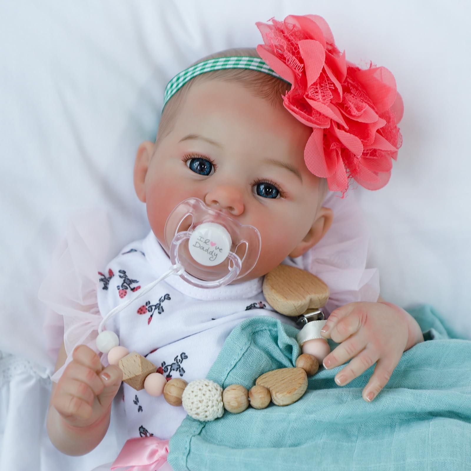 Experience the joy and magic of parenthood with our meticulously crafted Reborn Baby Doll. This doll is designed to bring lifelike realism and heartfelt warmth to collectors, children, and anyone who cherishes the beauty of lifelike dolls. Each doll is a testament to exceptional artistry, with hand-painted features that capture the essence of a real baby, including realistic skin tones, delicate blushing, and lifelike veins. Every crease and wrinkle is carefully added to mimic the natural appearance of a newborn, enhancing the doll's authenticity. The real-life baby doll's hair is carefully hand-painted, providing a natural look and feel. The bright grey-blue eyes, soft expression, and slight blush on the cheeks exude the innocent charm of a newborn, making the doll a delightful companion. Hand-applied eyelashes and hand-painted eyebrows further enhance the doll's realistic expression. Our real-lookig baby doll is weighted to provide the feel of holding a real baby, with a gentle weight and soft, cuddly body that make it perfect for hugging and nurturing. The flexible limbs allow for a variety of poses, enhancing the interactive experience. Made from premium, non-toxic vinyl, and silicone materials, this real baby doll is safe for children and the elderly, meeting the highest safety standards with ASTM F963 and EN71 certifications. Enhance your collection or delight a loved one with the exquisite craftsmanship and lifelike details of our Realistic Baby Doll. This doll is more than just a toy, she is a cherished companion and a work of art that brings the magic of a newborn baby into your home. Realistic Appearance: This reborn baby doll is 18 inches with soft vinyl limbs and head, combined with a cloth body, offering a lifelike touch. The gentle weight and soft, cuddly body make her perfect for hugging and nurturing. Handcrafted Detail: This newborn baby doll's hair is carefully hand-painted, giving her a natural look and feel. Her tiny fingers and toes are individually crafted with intricate creases and wrinkles, complete with hand-applied nails for a real touch. Realistic skin tones, delicate blushing, and lifelike veins capture a real baby's essence. Incredible Craftsmanship: With bright grey-blue eyes, and a soft expression, this reborn girl exudes the innocent charm of a newborn baby. Poseable arms and legs allow for natural, lifelike positions making her a delightful companion. Adorable Outfit: She wears a floral-printed bodysuit with delicate pink tulle accents, exuding elegance and sweetness. A large, vibrant coral flower headband adds a playful and eye-catching detail to her look, making her perfect for display or role play. Also can dress her in newborn-size clothes, making playtime more fun. Safety Certified: Made from premium and non-toxic vinyl, and have passed ASTM F963 and EN71 safety standards, our real-looking baby dolls ensure safety for kids and the elderly.