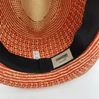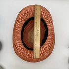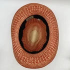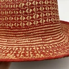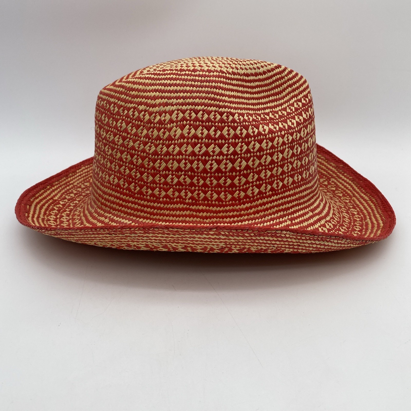Fedora style hat made from natural straw featuring a red woven pyramid pattern. Interior elastic band around the brim to ensure a snug fit. Handcrafted by artisans in Colombia. Measurements One size fits most : hat says size 6.5" on tag 2" brim, 5" crown, 22" circumference May have some light wear or it is from the handmade process. Please see photos as they are part of the description. Thank you for visiting!