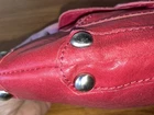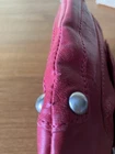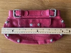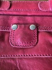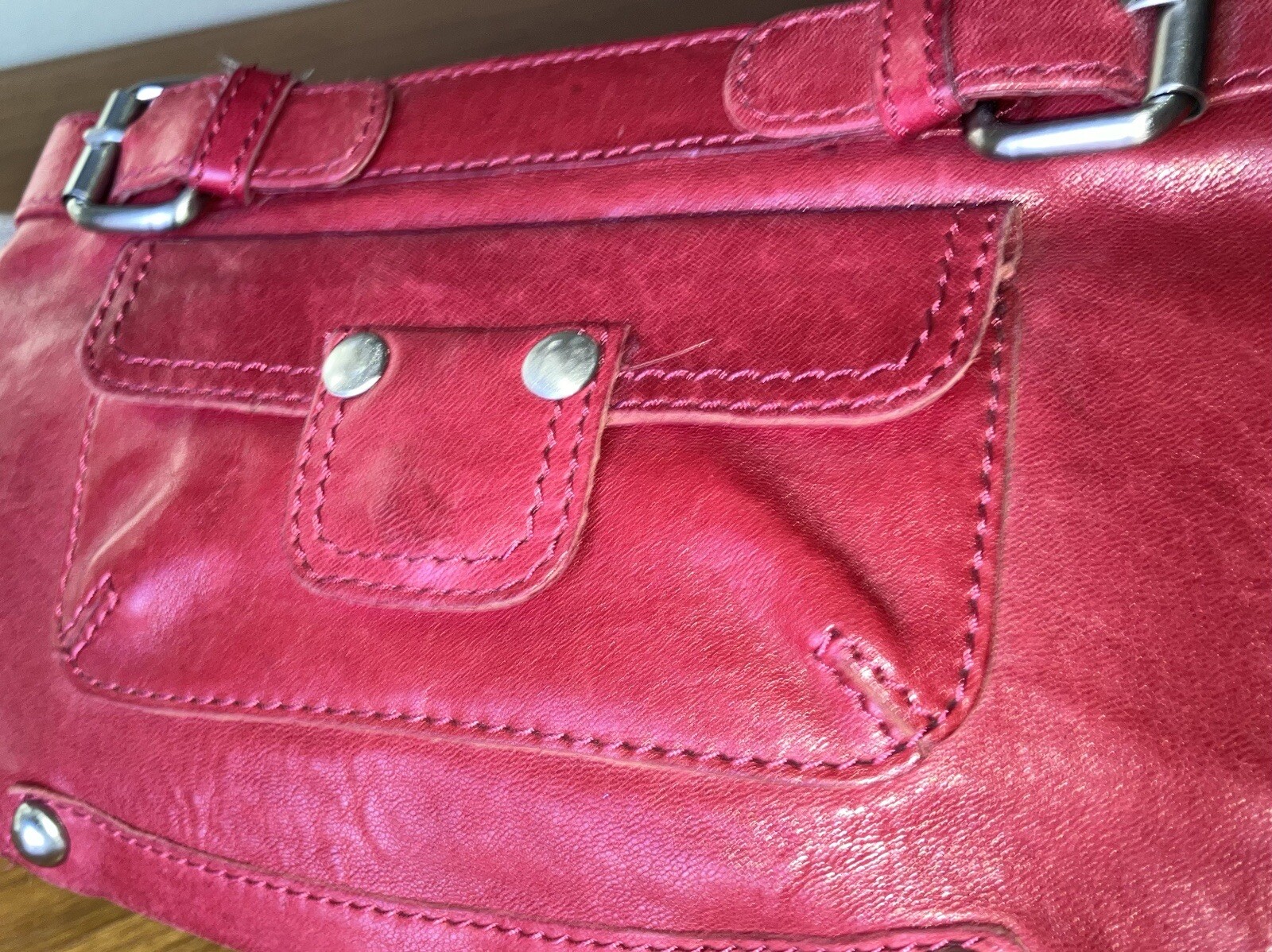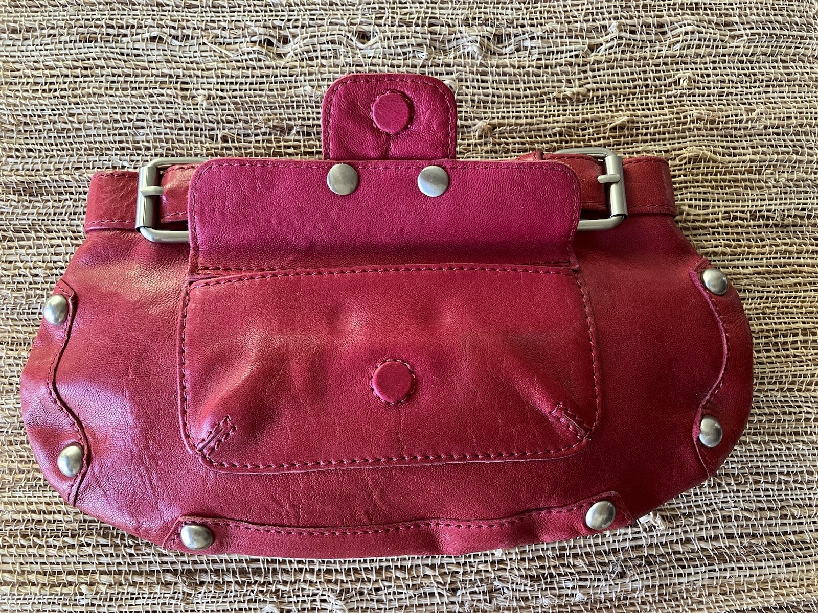 Soft, smooth, red leather clutch from Linea Pelle Collection. Small outside compartment with strong magnetic closure measures 5 ½ x 3”. Zipper compartment on inside. The piece itself has hinges (2) on the inside, connected to sturdy metal strips, safely securing the closure. This clutch has some weight to it as the leather is relatively thick. It’s gorgeous, unique and just plain fun. Please see photos for details, particularly the last 3 where I’ve focused on marks on leather.