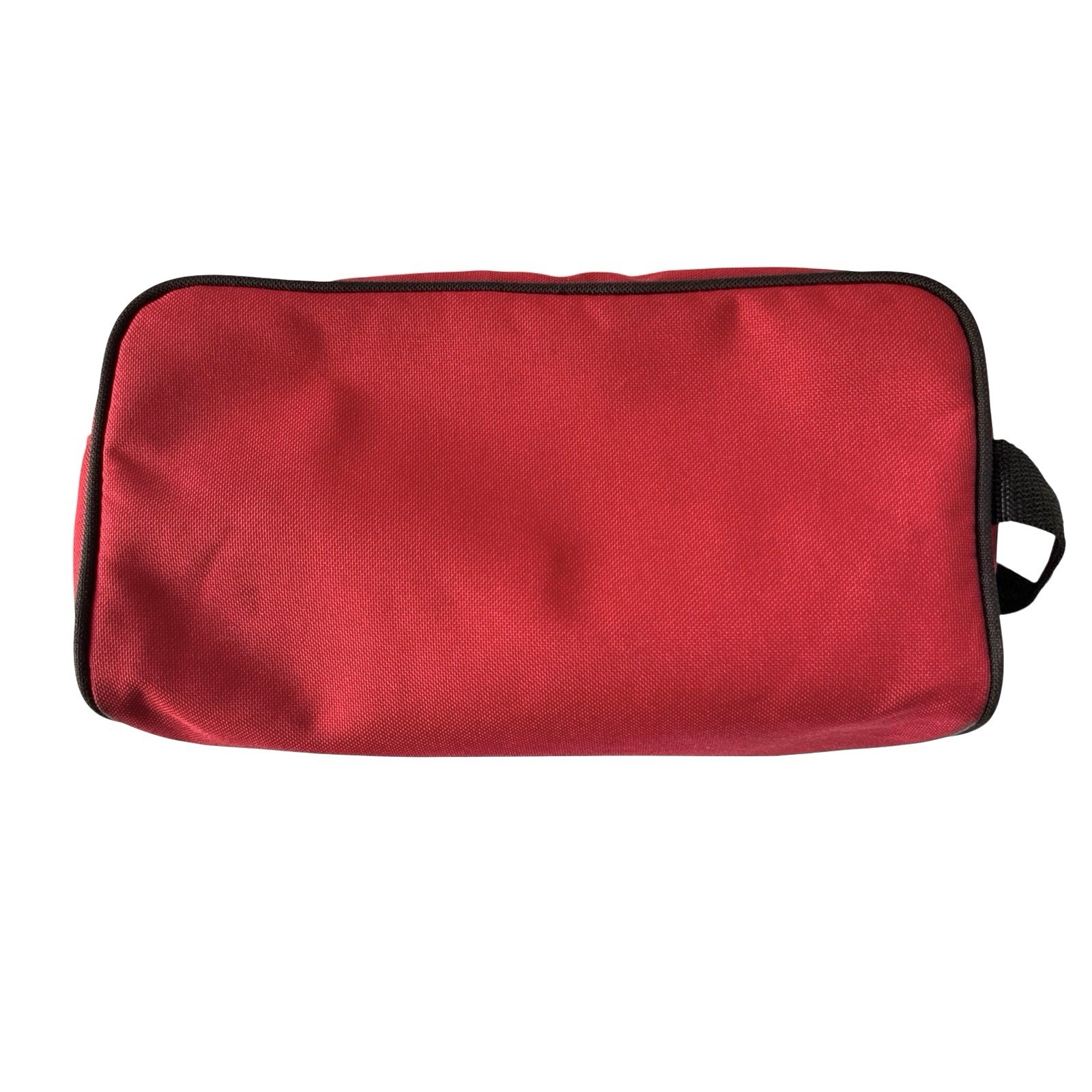 This toiletry bag has two top zippered compartments. Inside are removable mesh bags, one with hanger, that contain an assortment of plastic containers for your shampoo, lotions, etc. Two of the bottles have regular caps or the option of squeeze caps. Carry strap at one end. Red nylon. Size 10x5x4. In excellent pre-owned condition from a smoke and pet free home.