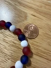Add a touch of patriotism to your wrist with this beautiful handmade beaded bracelet. The round glass and resin beads in red, white, and blue give a stunning representation of the American flag. Measuring 6.5 inches in length, this bracelet is perfect for any woman who loves unique and meaningful jewelry. Notice the noodle shape red, white and blue resin focal bead. Reversible, stackable, and organza gift bag included, this bracelet is a perfect addition to any jewelry collection. The bracelet is not only stylish but also a great way to show your patriotism. Made in the United States, this bracelet is a must-have for any patriotic occasion.