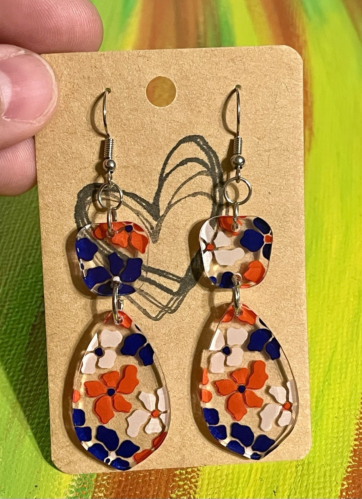 These Red, White, & Blue Floral Drop Earrings are perfect for celebrating the 4th of July in style. . Made with acrylic material and brass closures, these dangle/drop earrings feature a multicolor floral design that is nickel-free and made in the United States. . The patriotic theme and bright colors make them a festive accessory for any summer occasion. . This pair is right at 3 inches in length with hooks that secure them to the lobe for comfortable wear. Add a touch of charm to your outfit with these patriotic floral earrings. . Made in the United States, these earrings are a unique and eye-catching piece that is sure to stand out. . Last photo in the listing is of the backs of the earrings = double sided color!