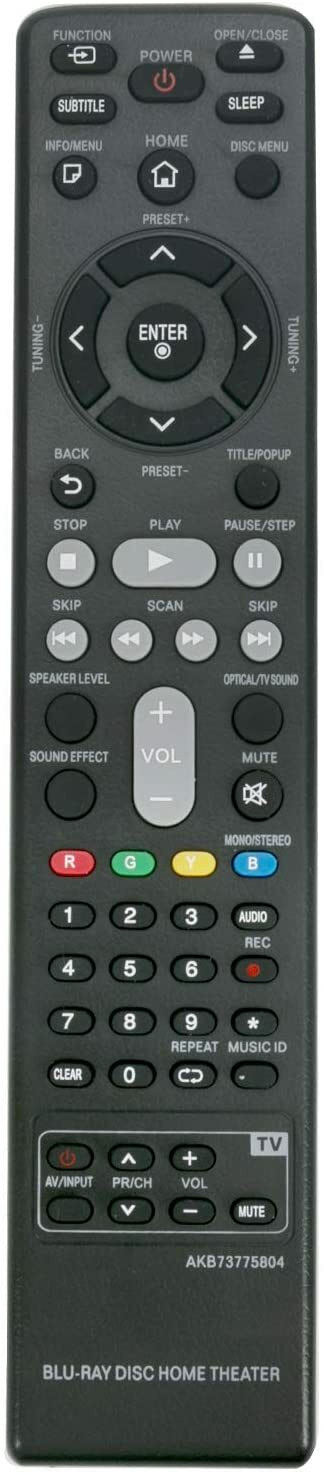 New Remote Control AKB73775804 for LG BLU-RAY DISC HOME THEATER Featuer: Model: AKB73775804 US Seller Faster shipping and excellent service No need setup, just insert new alkaline batteries to work well! The re mote compatible with LG Models: BH6730T S43S2-S BH4530T S43S1-W BH4430P S43T1-S S63T2-S S63S2-S/C BH6530T S63T1-S/C S63S2-C BH6430P S63S1-S BH6330H S63T1-S S63S2-S S63H1-S S63H1-C S63H1-W BH6230S S63T1-C BH6730P BH4030S BH6830SW BH6830SWMQ BH6730S S63S3-S S63S3-C S63T1-W W3-2 T2