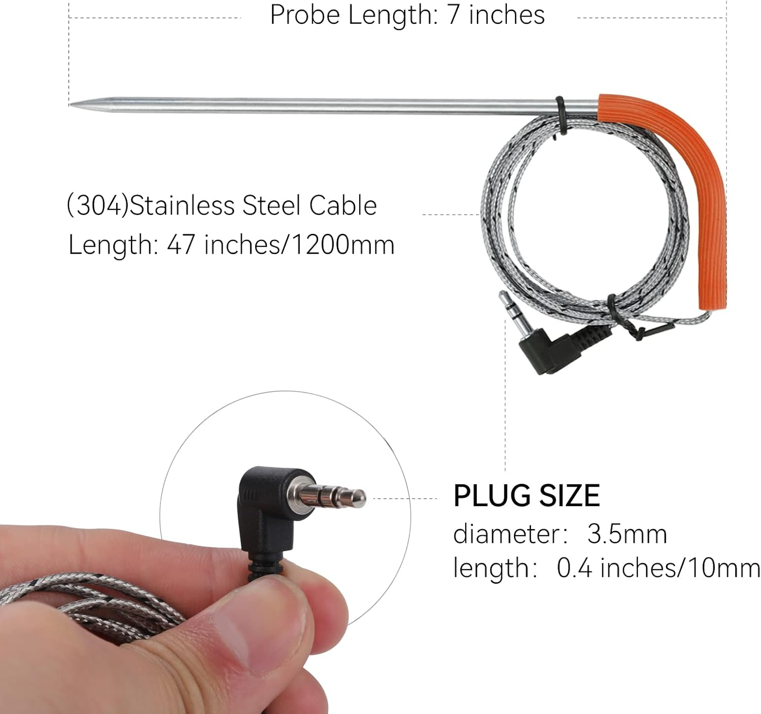 Replacement Meat Probe for Traeger - For use with all meat, Compatible with traeger grills and smokers with digital control meat probe capability. Replaceable or additional probes. HIGH QUALITY TRAEGER TEMP PROBE - Adoption a 3-layer compression interface to make our probes more waterproof, and the temperature probe is made of food-grade stainless steel. End wrapped with high temperature resistant silicone to prevent burns. The buck probe design provides fast, accurate food temperature or grill temperature readings and alerts you to temperature changes within seconds. TEMP PROBE CLIP - Holds probes and wires well, probe can withstand 1000°F (500°C) temperature, the stainless steel cable can withstand 718 °F (380°C temperature), 3.5MM plug Grill Accessories - 2 Pack meat temp probes, 2 Pcs rubber grommet and probe clip, Cook with ease and enjoy delicious food. Professional after-sales service - If you have any problems, please contact us through Amazon Messenger, we provide refund or exchange service, your satisfaction is our service goal! Product description 3.5MM not waterproof Anti-scald probe Avoid burns Waterproof probe tip, can be cleaned under the tap