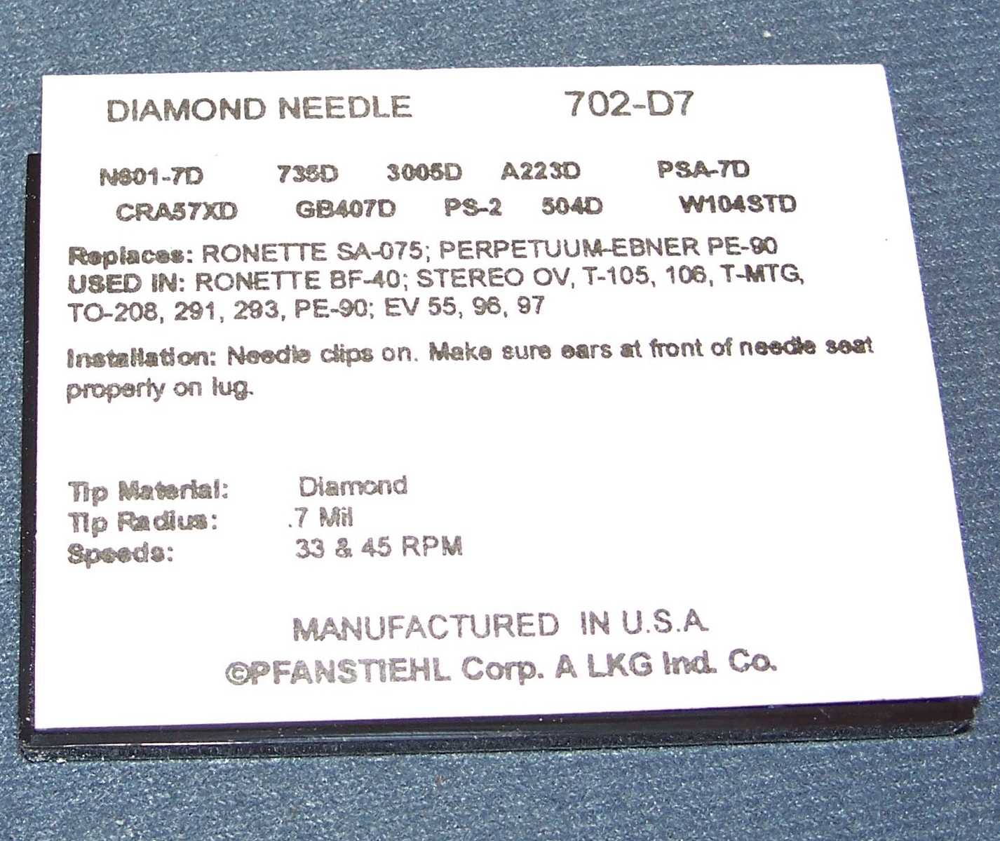 Phonograph needle, Pfanstiehl 702-D7. Replaces: Ronette 5304LD, 5304L, 5304LN, 5304N, N8-7d, 702-D7, SA-075, SA-250; Perpetuum-Ebner PE-90. Used in: Ronette BF-40; Stereo OV, Ronette T-105, Ronette T-106; T-MTG, Ronette TO-208, TO-291, Ronette RO-293, PE-90; PE-30, EV 55, 96, 97, Sonotone 15T-S, 14T. Tip: .7 mil diamond. Speeds 16, 33 & 45 RPM. New. 735D, 3005D A233D, PSA-7D, CRA57XD, GB407D, PS-2, 504D, W104STD. Search my store titles AND descriptions. Enter your needle no., cartridge no., or brand name. E-mail for further help. IF YOU ARE PURCHASING A NEEDLE Model numbers are provided in manufacturer's references for the cartridge they installed in those models. If the cartridge has been changed by a dealer or user, this needle will not be correct for the model numbers listed, as it is the cartridge that determines what needle is needed. Be sure it looks like your old needle.