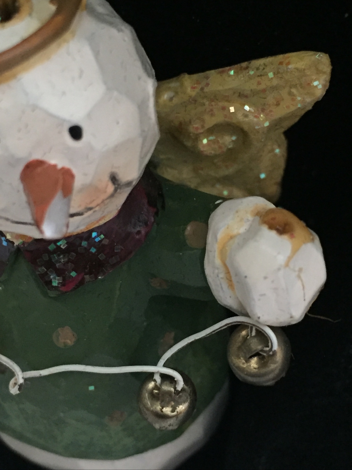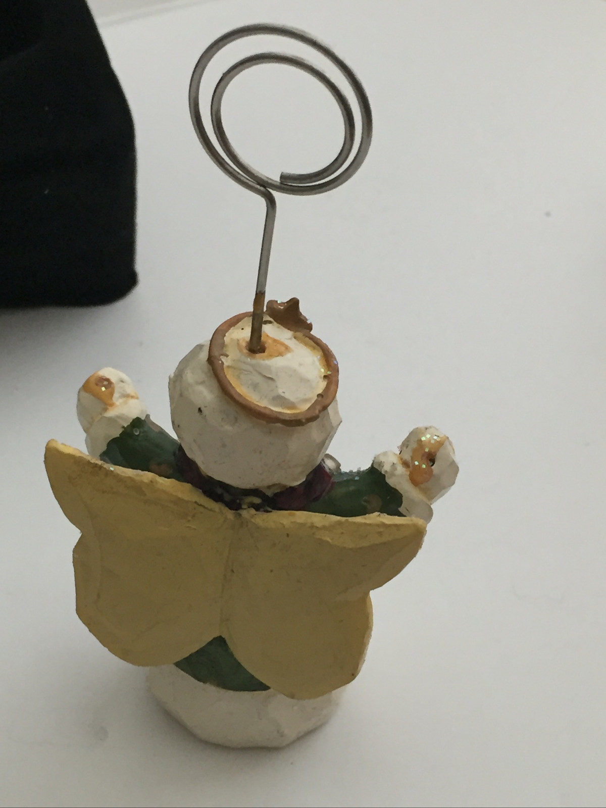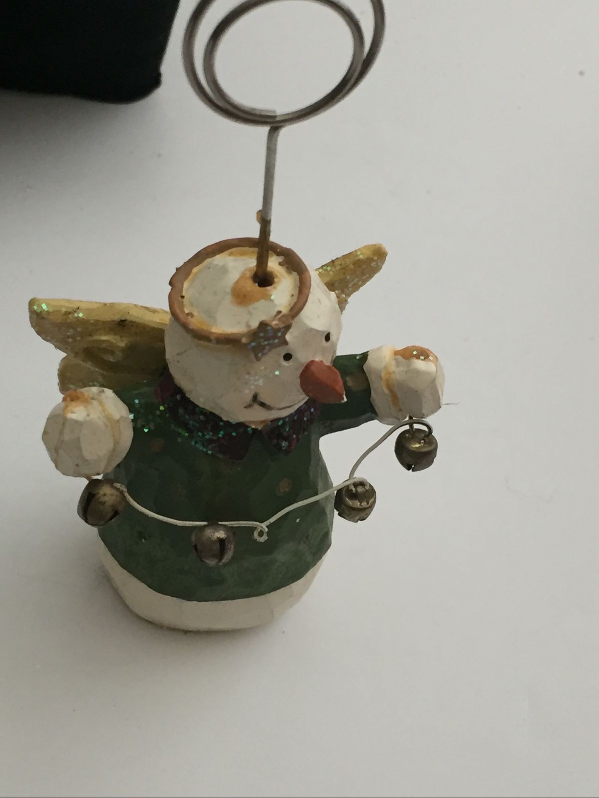 Photo Card Holder Decor Resin Snow Angel Ornament 5.75" T Holding Bells Trim 1299 pre owned condition- SMALL CHIP ON NOSE-see all PICS as part of description and condition.
