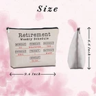 Retirement Gifts for Women Friend Travel Zipper Makeup Bag Retired Gifts for Women Humorous Retirement Gifts Bag for Coworker Sister Grandma Mom Aunt Boss Teacher Product Details Color: retirement weekly schedule Brand: Yegifeyct MPN: MHXP03 UPC: Does not apply EAN: Does not apply Product Dimensions: 9.45 x 7.48 x 0.04 inches Item Weight: 1.41 ounces Department: Women Manufacturer: Yegifeyct Country of Origin: China Item model number: MHXP03 [Retirement Gifts for Women 2023]: The portable makeup bag with lightweight design is easy to carry.The zipper is heavy duty and not cheap and flimsy,double-sided printed with:retirement weekly schedule Monday do Tuesday whatever Wednesday the Thursday hell Friday i Saturday what Sunday to do,this is a perfect gift to share with your friends and family. [Unique Gift Ideas]:Our designer designed some fashionable fun themes for the cosmetic bag,It can be given to mom, grandma,aunt,boss, coworker, her, bff ,bestie, daughter, sister,best friends,niece family.perfect gifts for festivals,such expecting retirement gifts or other special days and more!it will remain vibrant with daily use for women. [Durable Material]:polyester material, featuring a sleek black zipper with a silver puller,won't fade and get stuck after repeated use.Hand washable, machine washable. it can also store daily necessities such as jewelry, keys, cards, mobile phones,sunglasses,etc. this cute and fun graphic little bag can be used as makeup bag, travel case and so on, easy to use on any occasions.Perfect travel accessories for women! [Product Size]:Proper size and space, the good size for a travel cosmetic bags measure approx :9.5*7.5inch, which has plenty of storage space to store your lots of cosmetics.This is a good choice as a gift for someone special!This product is not suitable for people over 13 years old. [Satisfied guarantee]:We will provide you with the best quality and services, if you have any questions after you receive the goods, please contact us within 24 hours. We will resolve it as soon as possible. Double-sided printing travel cosmetic bag has a good-looking style and is easy to carry and uses polyester material, It is very suitable for women to go out hand bag, which is very comfortable to use.
