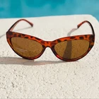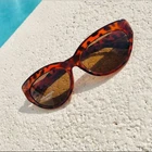 Cat-eye tortoise sunglasses. Red/brown/orange color with black print.