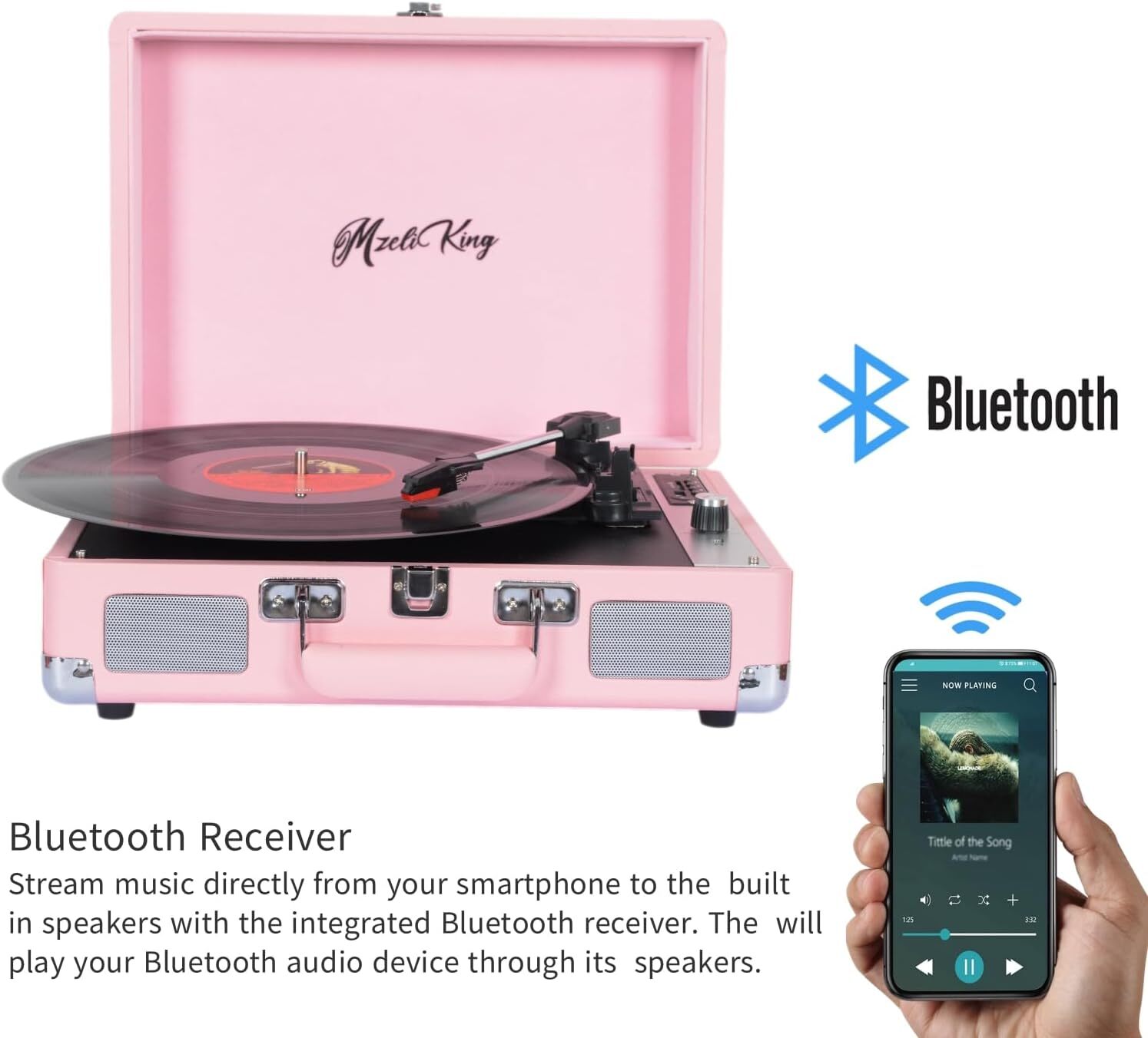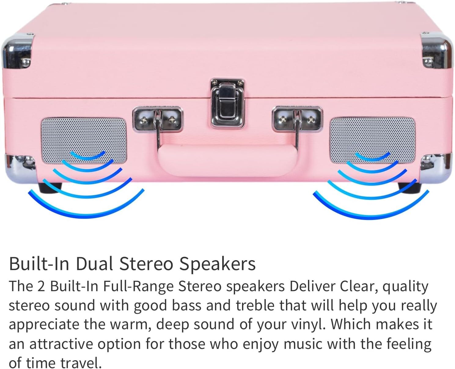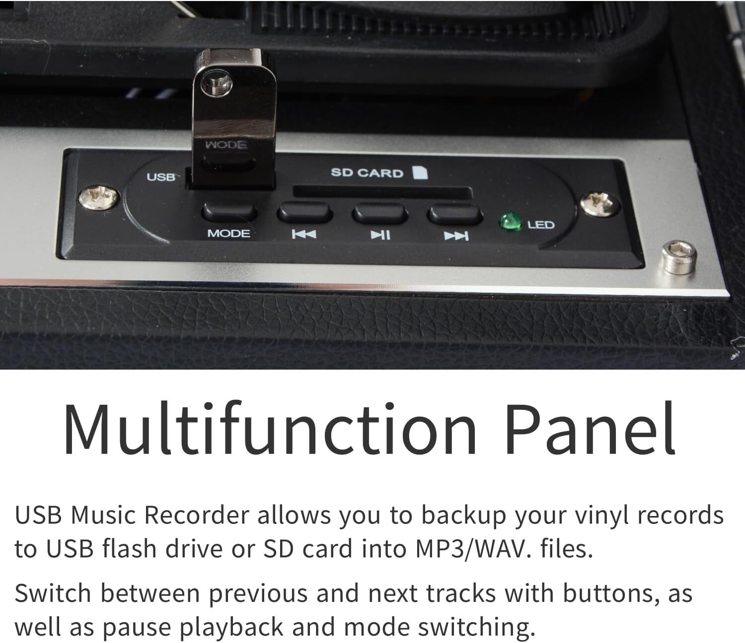 Multi-function Record player: The turntable integrates Bluetooth 5.3 pairing/USB card playback/SD card playback/RCA output/AUX line input/headphone jack to meet your various connection needs. Therefore, it can be connected to external speakers or headphones to enjoy vinyl music instead of using the built-in speakers. Additionally, you can also connect audio input devices such as smartphones or MP3 players to this turntable to play digital music. 3-speed belt-driven vinyl record player : Adjustable 3 speeds (33/45/78 RPM) turntable with a 45 RPM adapter included, allowing you to play your 7/10/12-inch vinyl records. Each turntable is manually tuned by our audio experts to ensure better performance. Vintage fashion vinyl turntable: The record player with a variety of color vintage carrying case designs is perfect for home decoration and entertainment. Moreover, it will be an excellent gift for your family and friends on birthdays or Christmas, especially for vinyl enthusiasts. Built-in preamplifier and dual-channel speakers: The compact integrated audio system includes a built-in preamplifier and dual speakers, providing you with stereo sound quality and immersive music enjoyment. Worry-free warranty: Lifetime technical support, 30-day money-back guarantee, and an additional 365-day quality warranty for free replacement or exchange of new products. If you encounter any problems, please feel free to contact us, and we will provide technical support within 24 hours. The all-in-one record player and portable suitcase recorder can accompany you anywhere. The vinyl record player effortlessly plays your favorite audio, including vinyl records, Bluetooth, USB flash drive playback, SD card playback, or 3.5mm auxiliary input through our built-in amplifier. The RCA audio output allows the record player to connect to external speakers for a bigger sound, while the headphone jack allows you to enjoy private listening. Multiple modes allow you to conveniently enjoy your music moments. Vinyl Turntable Features: 1.3 Speeds Turntable for 33 ?,45,78 RPM Vinyl Records 2.Turntable Drive Type: Belt Drive 3.AUTO STOP ON/OFF 4.Dual Built-in Stereo Speakers 5.Audio Input/Output Methods: Bluetooth,RCA Output Jack;Headphone Jack,USB/SD/Playback 6.Audio Input Methods: Auxiliary Input 7.MDF Hardwood Frame Wrapped with Superior Leatherette ?Package Includes: 1.Suitcase Vinyl Record Player 2.English User Manual 3.Power Adapter 4.45 RPM Adapter ?Warranty 12-month warranty and lifetime customer service