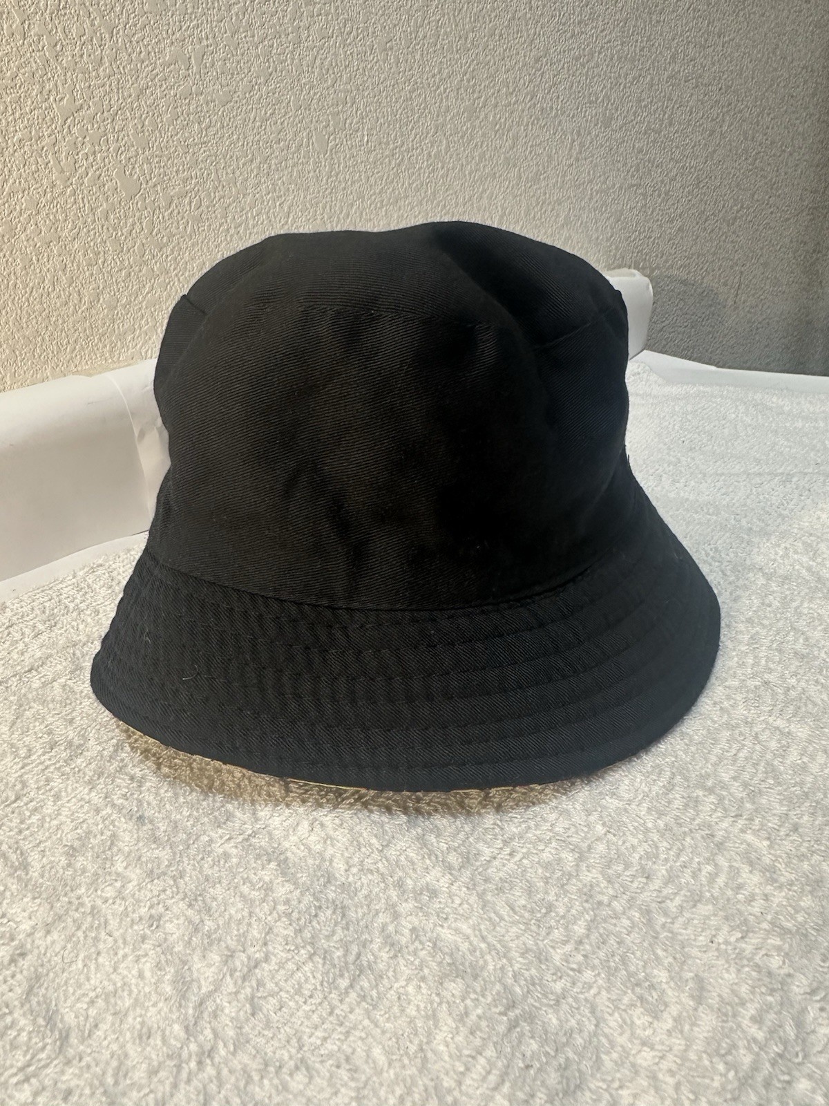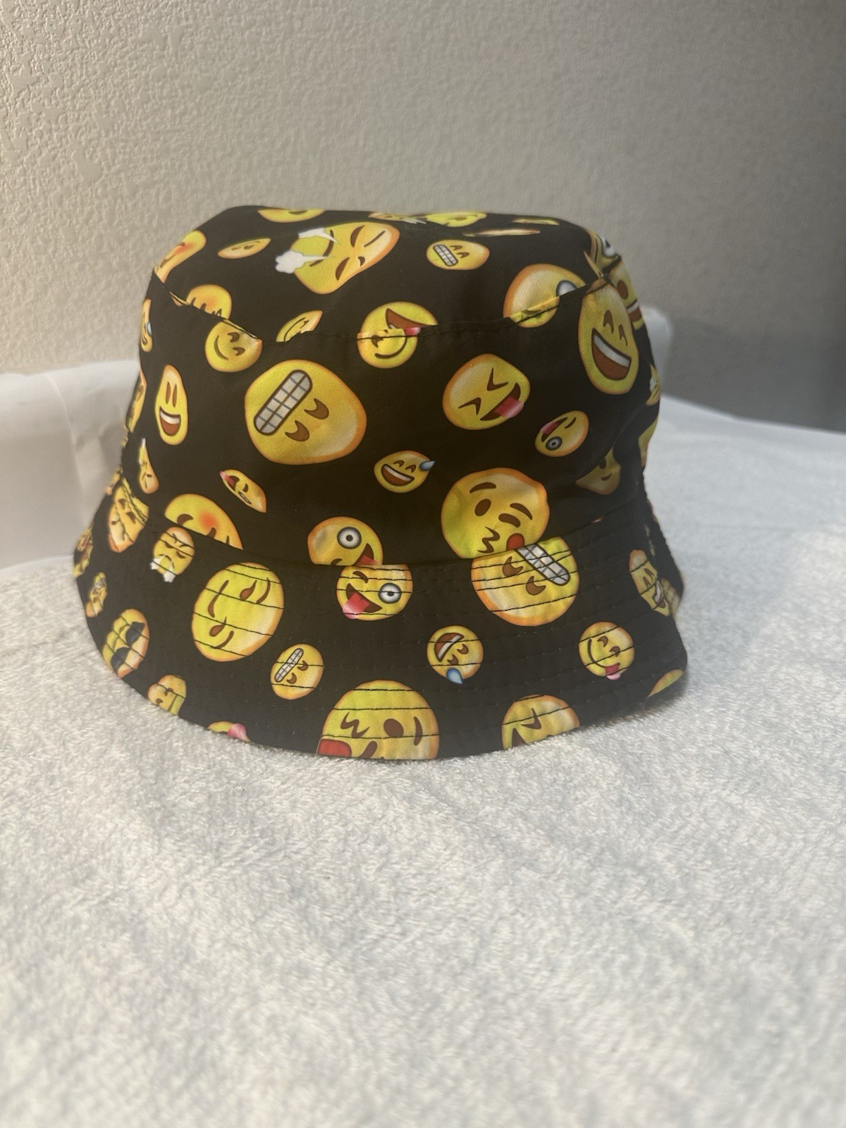 The product is a reversible bucket hat for men, featuring a solid black color on one side and various emojis on the other. Made from a blend of polyester and cotton, this casual accessory is suitable for everyday wear. The one size fits most design makes it a versatile addition to any man's wardrobe. The stylish bucket hat provides protection from the sun while adding a fun and trendy touch to any outfit.