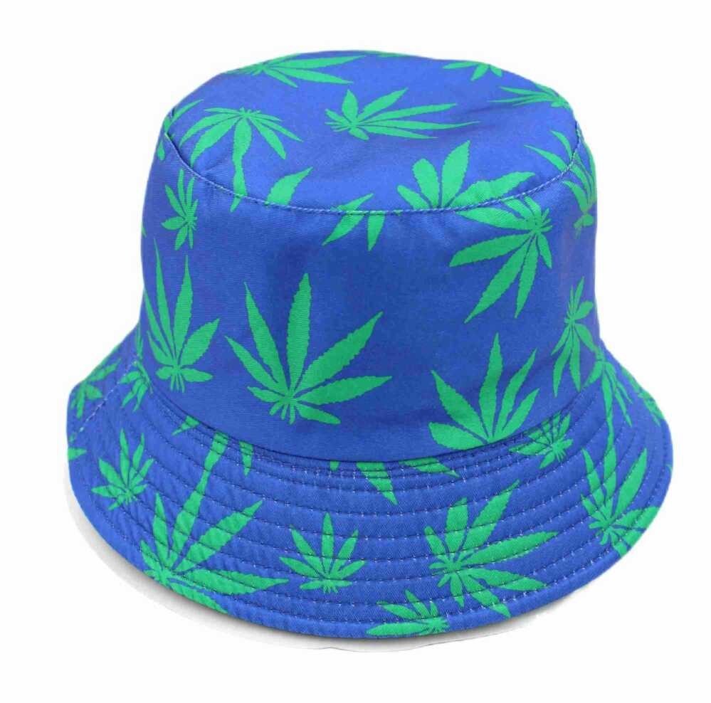 BUCKET HAT GREEN MARIJUANA AND BLUE LEAF PRINT UNISEX SUN STYLE REVERSIBLE