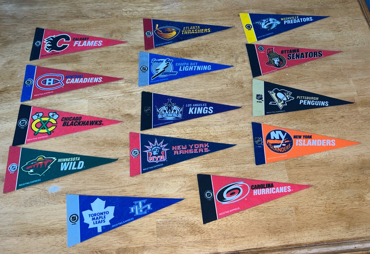 Rico Tag Express Mini Pennants NFL/NBA/MLB/NHL Teams 9”x4” Lot Of 39 Flags. Condition is Used. Shipped with USPS Ground Advantage.