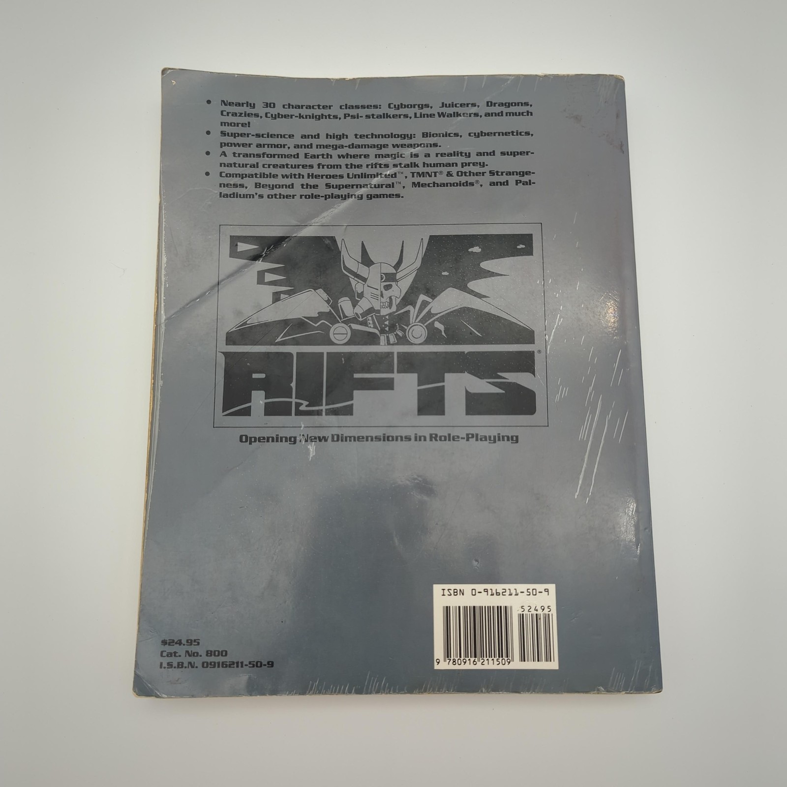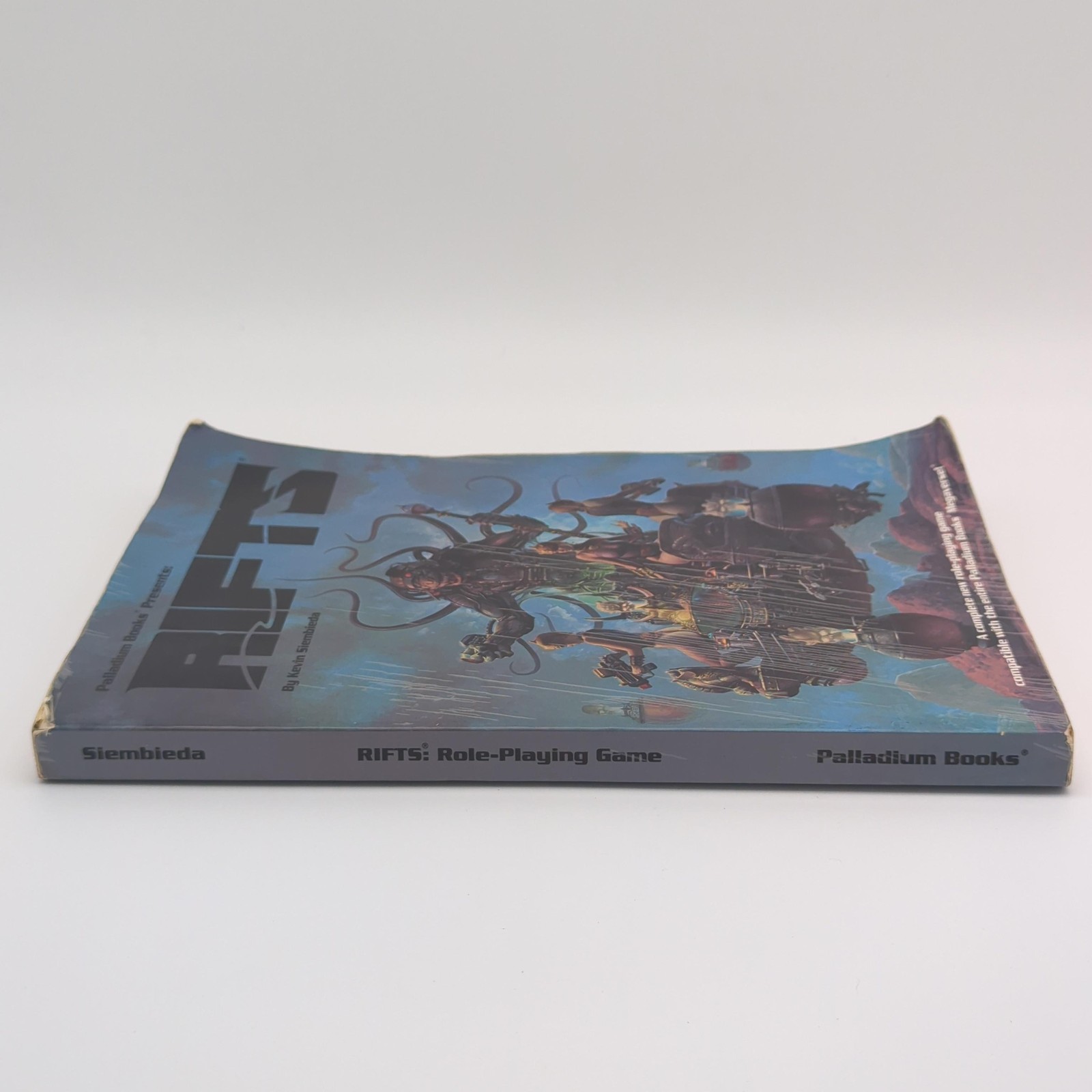 Vintage Rifts RPG Core Rulebook by Kevin Siembieda, published by Palladium Books in July 1993, sixth printing. Condition: Good used vintage condition. Moderate shelf and cover wear including visible creasing, edge wear, scuffs, and corner bumps. Binding is intact. Interior pages are lightly aged with no missing pages noted. Softcover book. Cover features the original Keith Parkinson artwork. Complete game rules compatible with the Palladium Books Megaverse system. Includes character creation, world lore, super-science, magic, and more. A classic sci-fi and fantasy role-playing game sourcebook. ISBN: 0-916211-50-9. Cat. No. 800. Printed in the United States of America. Nearly 30 character classes: Cyborgs, Juicers, Dragons, Crazies, Cyber-knights, Psi-stalkers, Line Walkers, and more. Compatible with other Palladium RPGs including Heroes Unlimited, TMNT, Beyond the Supernatural, and The Mechanoids. Cover art, interior illustrations, and layout are as shown in photos. All original vintage content and artwork. This is a highly collectible vintage RPG book perfect for fans, collectors, and role-playing enthusiasts.