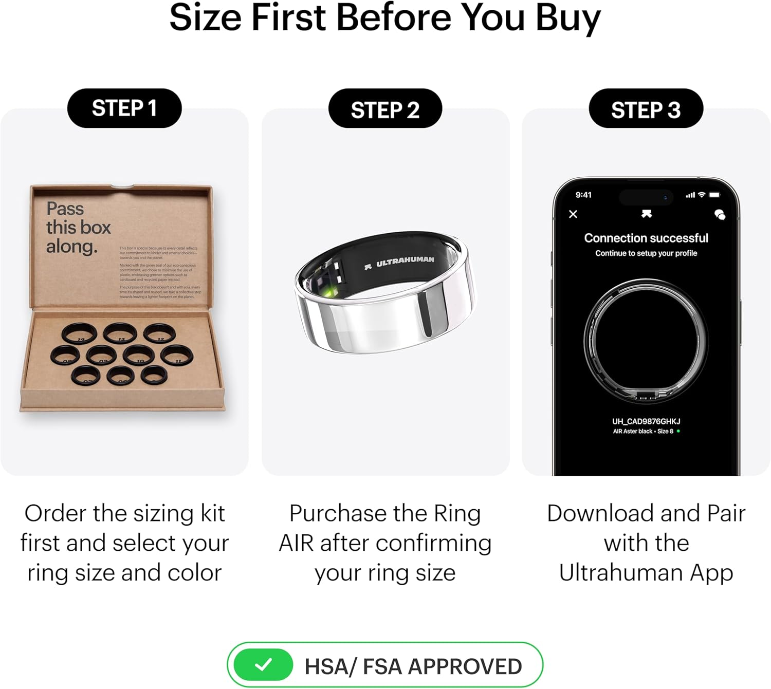 Store New Arrivals Add to Favorite View Feedback Contact Ring AIR - Sleep & Fitness Tracker, Fsa-Approved Wearable, Smart Ring for Women & Men, No App Fee for Standard Features (Size 11) Description Item model number RA-RT-Size14-US Battery Capacity 24 Milliamp Hours Operating System App Battery Cell Composition Lithium Polymer Color Space Silver Memory Storage Capacity 0.5 MB Country of Origin India Batteries 1 Lithium Polymer batteries required. (included) Item Weight 3.39 Grams Manufacturer Healthcare Pvt Ltd Connectivity Technology Bluetooth Wireless Communication Standard Bluetooth Shape Round GPS No GPS Special Feature Sleep Monitor, Multisport Tracker, Activity Tracker, Custom Activity Tracker, Heart Rate Monitor Package Dimensions 8.5 x 6.63 x 3.13 inches Size 11 BUY THE SIZING KIT FIRST: Ultrahuman Ring sizes differ from standard ring sizes. Purchase the Ultrahuman Sizing Kit first, which includes a ring sizer, to accurately determine your size. The Ring AIR is available in 10 sizes (5-14), ensuring a comfortable, secure fit. Using the sizing kit helps you avoid returns and exchanges, ensuring you select the right size before purchasing. COMPREHENSIVE HEALTH TRACKING: The Ultrahuman Ring measures a wide range of metrics including sleep, activity, stress, heart health, movement, workouts, and recovery. Stay on top of your health and fitness goals with detailed insights to optimize your performance and well-being. WOMEN’S HEALTH INSIGHTS: With Ultrahuman Ring's advanced women's health features, track ovulation, cycles and pregnancy. Through multi-biomarker-based tracking for those looking to conceive, predict a 7-day fertile window and pinpoint ovulation with precision. Access cycle tracking combined with biomarker-based personalized guidance for every phase (Menstruation, Ovulation, Follicular, and Luteal). With Pregnancy Mode, expecting mothers get tailored pregnancy insights throughout each trimester. ONE APP, NO SUBSCRIPTION: Enjoy all the essential standard features of the Ultrahuman Ring, including sleep, activity, stress, heart rate, heart rate variability, skin temperature and recovery with no subscription — on the Ultrahuman App. ADVANCED SLEEP TRACKING: Ultrahuman Ring provides detailed insights into all your sleep stages — REM, Deep Sleep, Light Sleep and Wakefulness, along with actionable steps and nudges to improve sleep so you're ready for the day. It also tracks sleep debt, helping you understand your overall sleep quality and identify areas for improvement. Optimize your rest and recovery with accurate, personalized sleep insights. RECOVERY & ACTIVITY INSIGHTS: The 'Movement Index' keeps you moving for optimum glucose metabolism and fitness, increasing non-exercise energy usage throughout the day. Track steps, workouts, and calories for insights into your activity. Ring AIR also helps you recover better with enhanced recovery tracking. 'Dynamic Recovery' blends key metrics like heart rate, HRV, and skin temperature, tracking sleep and lifestyle to provide actionable insights MINIMAL FORM FACTOR & DURABILITY: The Ultrahuman Ring is crafted from space-grade titanium, offering unmatched strength and lightweight comfort. It’s water-resistant up to 100m, making it perfect for everyday wear, workouts, and even swimming. HSA/FSA ELIGIBLE: The Ultrahuman Ring is HSA/FSA eligible, allowing you to use your health savings or flexible spending account to purchase the ring. This makes it easier to invest in your health and wellness while saving on taxes, making it a smart choice for anyone looking to optimize their fitness and recovery. A GAME-CHANGING PERSPECTIVE ON STRESS: Get a deeper understanding of stress with a unique "Stress Rhythm Score" which considers the variations in your Heart Rate (HR), Heart Rate Variability (HRV), and Resting Heart Rate (RHR) against the backdrop of your circadian rhythm. POWERPLUGS - Your health journey is unique, and PowerPlugs allows you to focus on what matters the most, to you. Understand how your heart responds to activities, stress, and rest, with the Cardio Adaptability PowerPlug; track your screen time and its impact on your health with the Screentime PowerPlug; enhance alertness and improve wakefulness with the Caffeine Window PowerPlug; and more. Product Description The video showcases the product in use. The video guides you through product setup. The video compares multiple products. The video shows the product being unpacked. Ultrahuman Ring AIR Merchant Video Understand Your Sleep Quality & Quantity Understand Your Day-to-Day by Cycle Tracking Decode How Your Body Responds to Stress Know When to Push or When to Pause Track Your Journey of Pregnancy Week-by-Week 1 Sleep Index 2 Cycle & Ovulation 3 Stress Rhythm Score 4 Recovery Score 5 Pregnancy Insights ABOUT US We offer the best prices around on high quality products. Our E-store includes media such as books, movies, music and games while offering electronics, toys, sporting apparel, clothing, tools, general home, garden items and more. SHIPPING We are always working hard to ensure your package arrives as soon as possible. Please understand that some factors like weather, high postal traffic, and the performance of shipping companies are outside of our control. We offer free shipping to the lower 48 states and ship within 2 business days of payment, usually sooner. We do not accept P.O. Boxes. Please provide a physical address. For shipping outside of the continental USA, we only use eBay's Global Shipping Program.The item is shipped to KY and then sent to the rest of the world. International customers are responsible for all duties and taxes. Continue to check out in order to calculate costs for shipping the item to your country. Messages regarding eBay's Global Shipping Program MUST be directed at eBay EXCLUSIVELY. RETURNS We offer a 30-Day Return Policy on items which you are not completely satisfied with. You have the option for a full-refund or an exchange of the it