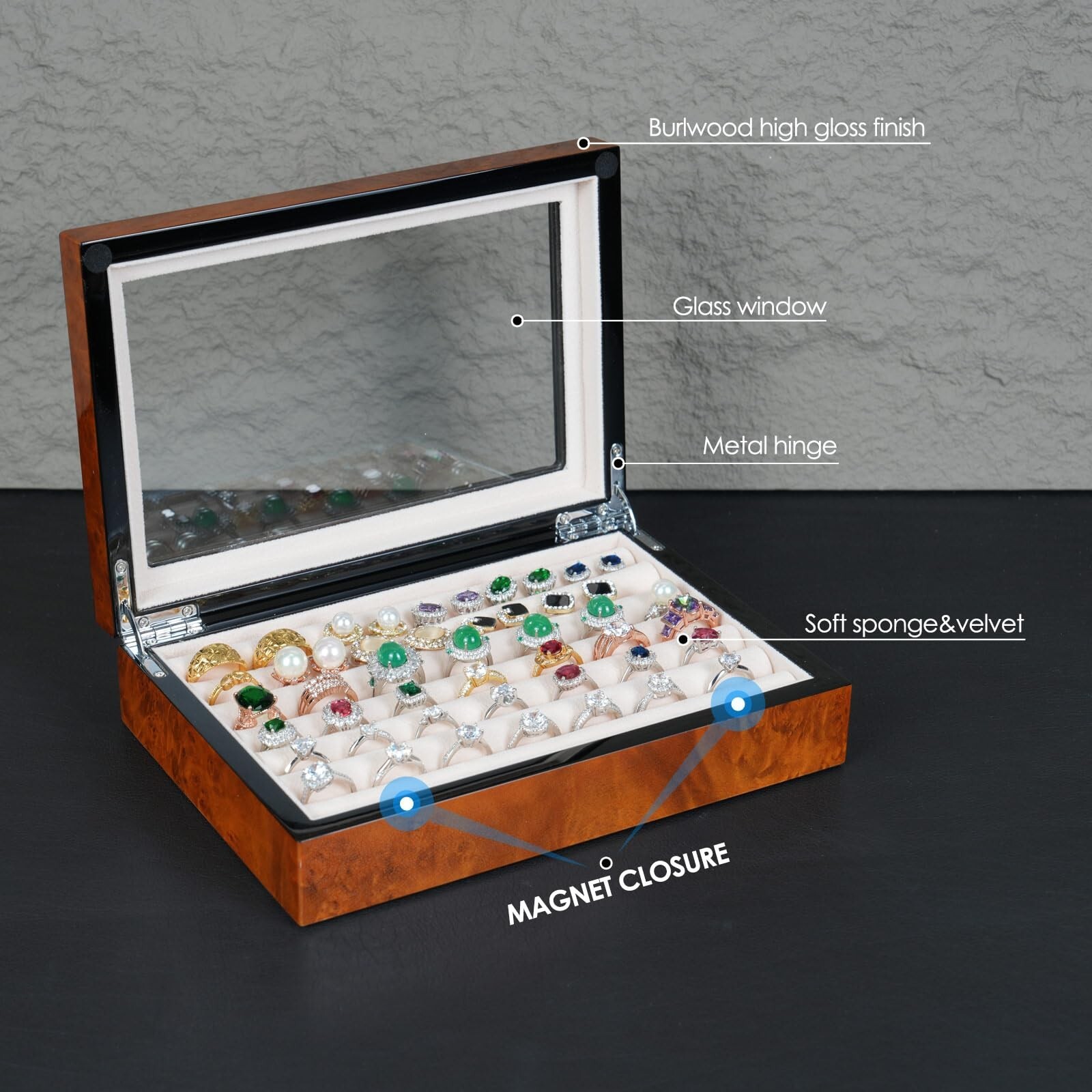 This ring box organizer is a game-changer for keeping jewelry neat and accessible! The 42 slots fit rings and cufflinks perfectly, while the sleek burlwood design and magnetic closure add a touch of elegance. The large glass window makes it easy to see everything at a glance, and the compact size is great for travel. Sturdy, stylish, and super functional—love it!