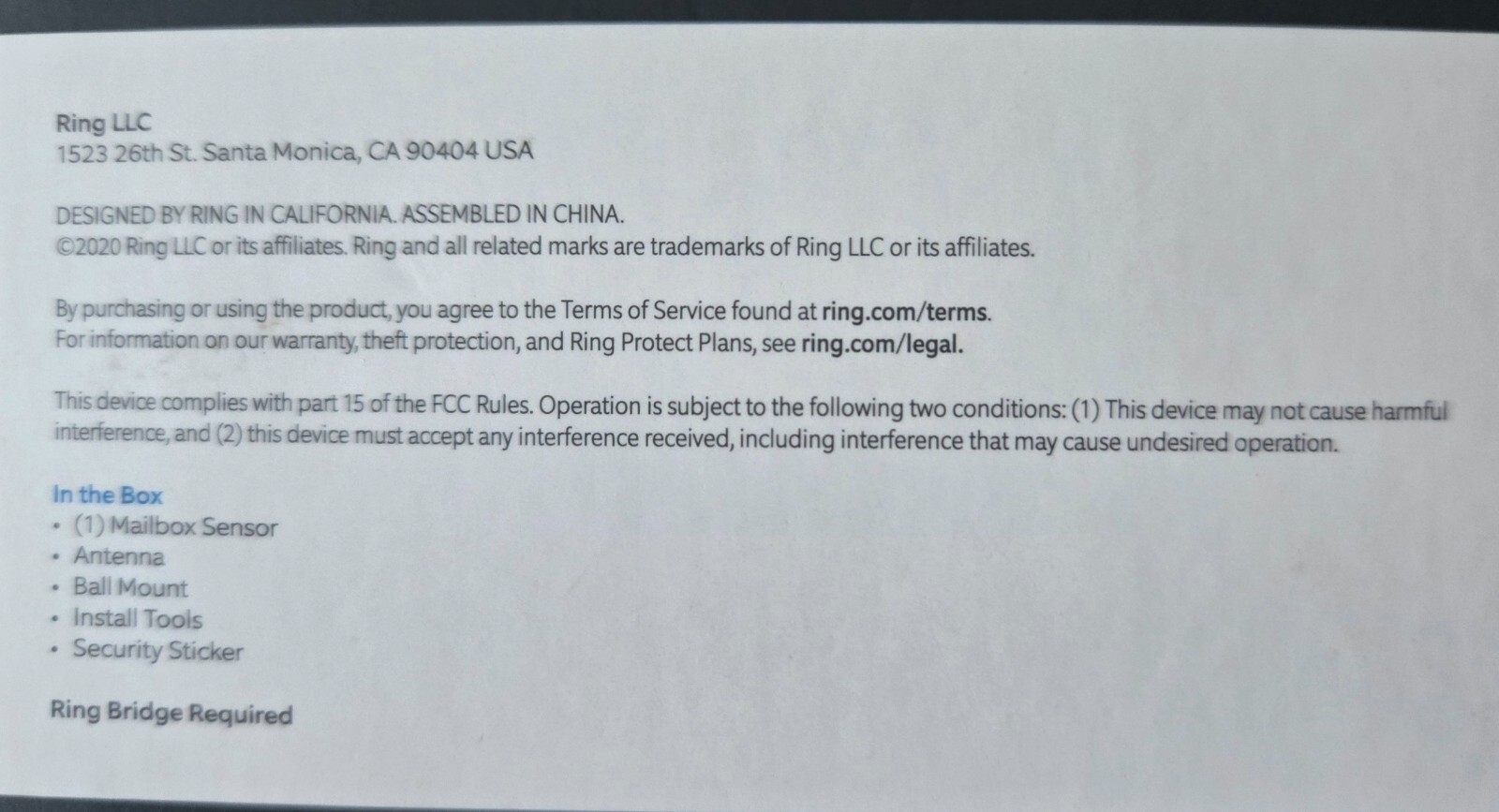 New in the box black Ring Mailbox Sensor. The box has been opened, but it is brand new, never used. Battery-powered motion sensor for your mailbox Get alerts when your mailbox is opened or detects motion Pair with Ring Bridge (sold separately) & Ring App for alerts Know when mail arrives or someone opens your mailbox. When Mailbox Sensor detects motion, you'll get a real-time alert in the Ring App or via connected Alexa-enabled devices. It can also tell your Ring Smart Lighting, Cameras, and Doorbells to turn on-helping to light up your yard and record what's happening (subscription required, sold separately)1 Color Family: Black Connectivity: Wireless (Wireless Network Transmission) Field of View: 120 Degrees Included: Mounting Hardware Indoor/Outdoor: Outdoor Pack Size: 1 Power Source: Battery Operated Sensor Location: Mailbox Sensor Recognition: Motion Sensor Technology: PIR Transmission Range (ft.): 15 ft Certifications and Listings: No Certifications or Listings Manufacturer Warranty: 1-year limited warranty. Use of Ring Mailbox Sensor is subject to the terms found here. Product Depth (in.): 2.56 in Product Height (in.): 1.47 in Product Width (in.): 2.44 in PAYMENT is due immediately upon purchase. COMBINED SHIPPING: Yes! we combine shipping and will refund any difference at the time we process your order.