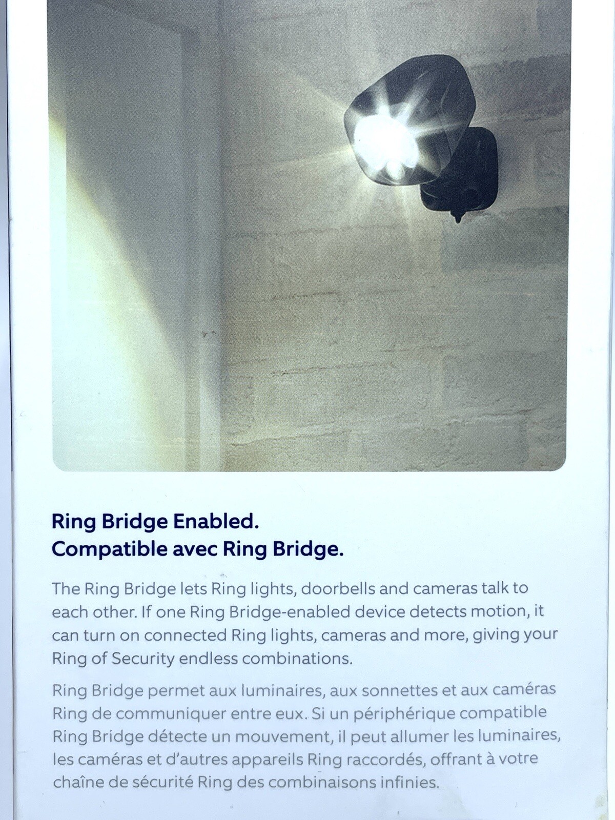 Ring Smart Lighting Spotlight 400 Lumens Motion Activated. Item is new and unused. Was a display model in a glass case. Only has French instructions in box. English available on the internet.