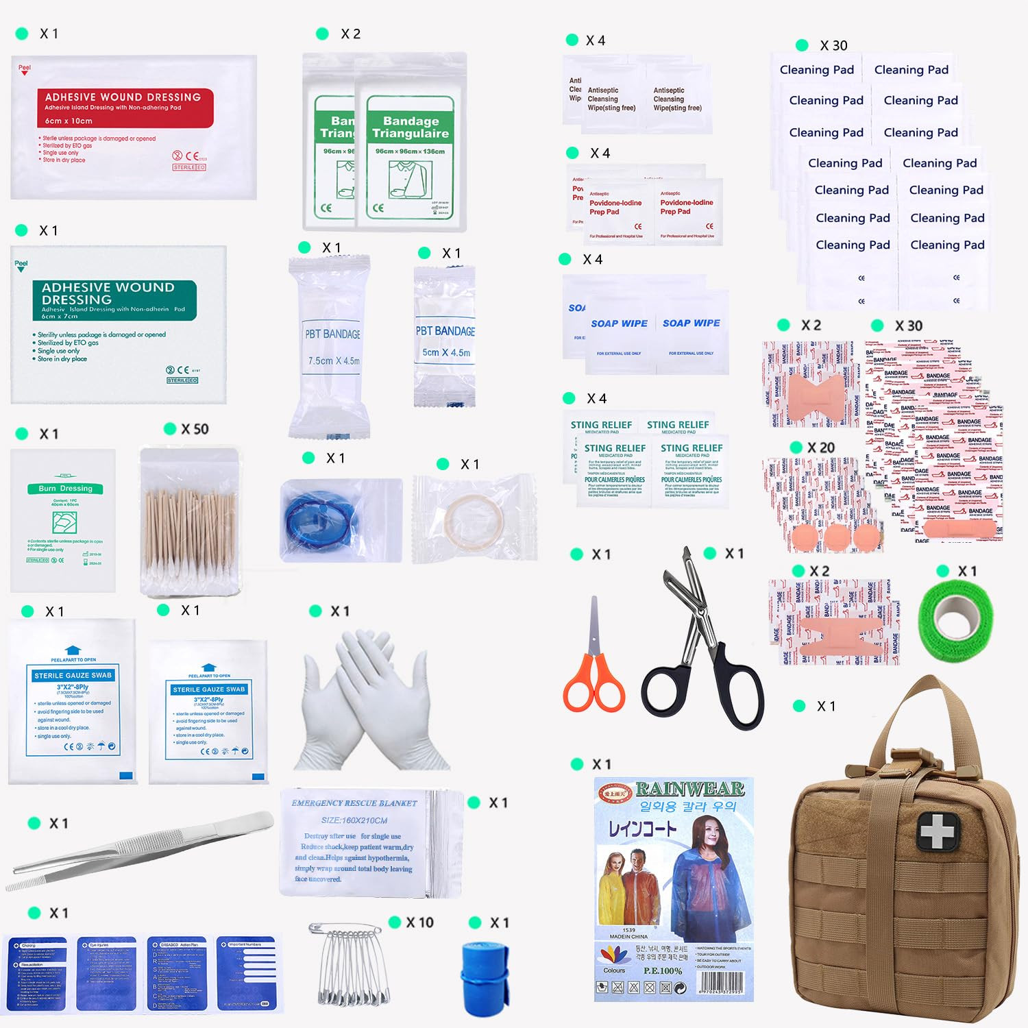 ★INCLUDED: 180 piece essential medical supplies for backcountry expeditions. Be Desmond Thomas Doss saving your family and friends in an emergency. ★PREMIUM QUALITY: The rugged 1000D nylon fabric and sturdy double stitching give the kit great durability in any environment, compared with the other versions 600D and 800D on the market, it's four and eight times stronger than them. ★EXTRA SPACE UPDATED: 8"H X 8"W X 4"D, and the old version on market dimension is 8"H X 6.5"W X 4"D. Extra space meet DIY needs facing different situations. ★MOLLE SYSTEM UPDATED: Molle system on the back can attach the kit to any MOLLE compatible gears and also a bicycle, motorcycle, backpack, belt, vehicle seat etc, easy to attach and unfasten. ★RIP-AWAY FEATURE UPDATED: Open the buckle, rip the kit away from velcro platform. Save a lot of valuable time that makes wounded faster to get first aid support.