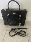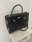 This is a stylish shoulder bag by River Island for women. It features a black faux leather exterior with gold details, including a gold handle/strap and gold lining. The hardware is black, adding a touch of contrast to the design.