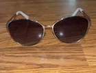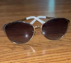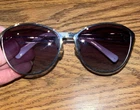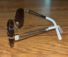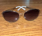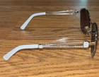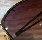 These designer glasses are beautiful with white and silver frames and a purple gradient lens. Unfortunately, the lenses have a bit of imperfections on one lens. There’s a crack bottom on the other lens. There’s a small crack at the top, neither of which impede vision when being worn. I ’m sure you’re able to purchase new lenses for these glasses if you desire. The frames are in great condition with the rocawear symbol on both sides on the temple pieces. . these aviator glasses are very contemporary and at the same time classic and look good on every body.