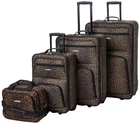 Description This beautiful deluxe 4-piece expandable luggage set is manufactured with a patented heavy duty EVA-molded hi-count fabric. This set is perfect for the serious and experienced traveler! Manufactured with the very best heavy duty polyester and PVC backing, this luggage set is designed for the traveler on the go and comes with three expandable uprights and a flight tote bag. It comes packed with features including: an inside retractable handle, EZ-Roll in-line skate wheels, back zippered secured pockets, top and side comfort grip handle, stability bars at the bottom to avoid tilting, and locks with keys. Upright features include: Clear in-line skate wheel system for smooth ride Push-button self-locking internally stored retractable handle system Ergonomic and comfortable padded top and side grip handles Two front full size zipper-secured pockets Three internal organizational pockets for all your traveling needs Each upright's interior is fully lined with a durable and elegantly imprinted lining Elegant silver pewter heavy duty industrial hardware Carry-On Flight Tote Bag features include: Elegantly imprinted full interior lining Detachable and adjustable non-slip shoulder strap Spacious main compartment Maximum strength industrial hardware 19-inch Carry-on Upright: 20 inches high x 12. 5 inches wide x 7. 5 inches expandable to 10 inches deep. 6 lbs. 24-inch Upright: 24 inches high x 16 inches wide x 10 inches expandable to 12 inches deep. 8 lbs. 28-inch Upright: 28 inches high x 18 inches wide x 12 inches expandable to 14 inches deep. 9 lbs. Carry-On Flight Tote Bag: 14 inches wide x 11 inches high x 5 inches deep – 1 lb. Carry-on Upright: 20"x 12. 5"x 7. 5" (with wheels).Number of wheels:2 24-inch Upright: 24"x16"x10" 28-inch Upright: 28"x18"x12" Tote: 14"x11"x5" Telescoping aluminum handle Full lining Expandable Skate wheels Fabric Type: 100% Polyester