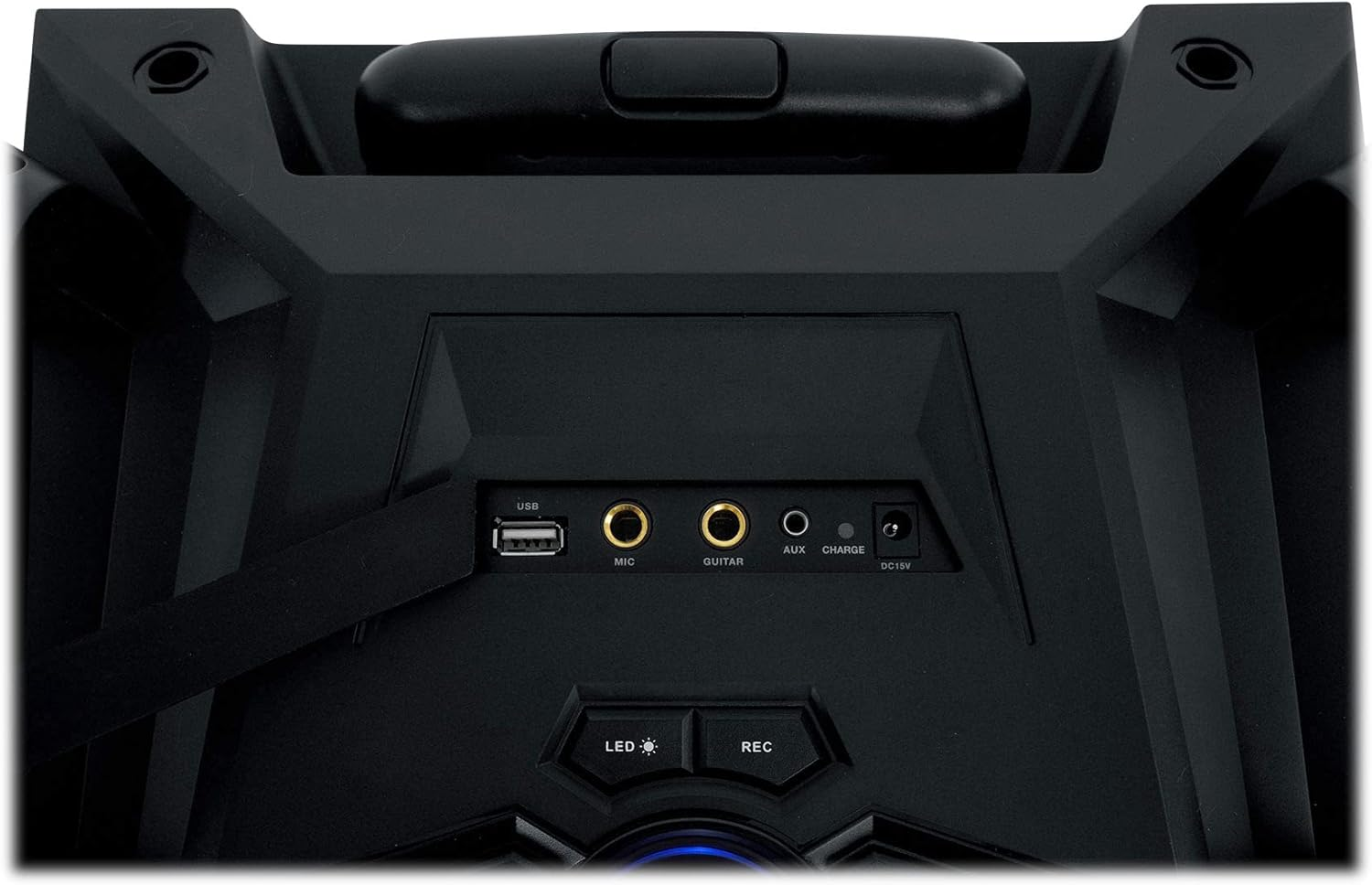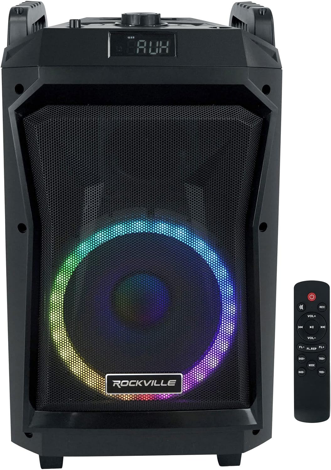 What's in the Box: 10" Wireless Speaker With Built in Bluetooth. Remote Control. Power Cable. Warranty Card. Owner’s Manual with video Rockville RockNGo 800 10” Portable Powered Speaker with Bluetooth, USB and LED. Peak Power Handling: 800 Watts. RMS Power: 120 Watts. The sound of this goes very loud and is very balanced with clear highs, strong midrange, and deep low-end bass response that goes down to 50Hz. This has way more bass compared to most other portable speakers. Built-in Bluetooth wireless music playback Built in wireless linking allows you to pair multiple of these speakers together in a party mode to spread sound throughout the space. Built-In USB. LCD Display for MP3 player. 3.5mm aux input. 1 Mic Input (1/4". 1 Line/Guitar Input for Guitar, keyboard, bass or Any Audio Device Guitar Input Volume Control. Mic Volume and Echo Controls. Built-In Wheels and Carry Handles for Easy Transport. Bluetooth Pairs in Under 4 Seconds and Has A 35 Foot Range with crystal clear reception. Bass/ Treble/ Master Volume Controls. Record Function Will Record Your Output Onto the SD Card or USB drive. Built in LED lights with ability to control the light pattern and the color of the LED (There is an EQ lighting mode, blinking mode, multi color mode, etc). LED can be synced with the beat of the music. Mic priority on/off function automatically lowers the music volume as you are talking into the microphone. Power supply: 15V/3A with external power supply 110V/60Hz. Battery lasts approximately 16 hours when using the unit on low volume, 8 hours on moderate volume and 5 hours on maximum volume. Product Description Rockville RockNGo 800 10" Portable Wireless Bluetooth Speaker w/LED/Wheels/Loud! What's in the Box: 10" Wireless Speaker With Built in Bluetooth Remote Control Power Cable Warranty Card Owner’s Manual with video Features: Rockville RockNGo 800 10” Portable Powered Speaker with Bluetooth, USB and LED Peak Power Handling: 800 Watts RMS Power: 120 Watts The sound of this goes very loud and is very balanced with clear highs, strong midrange, and deep low-end bass response that goes down to 50Hz. This has way more bass compared to most other portable speakers Built-in Bluetooth wireless music playback Built in wireless linking allows you to pair multiple of these speakers together in a party mode to spread sound throughout the space Built-In USB LCD Display for MP3 player 3.5mm aux input 1 Mic Input (1/4") 1 Line/Guitar Input for Guitar, keyboard, bass or Any Audio Device Guitar Input Volume Control Mic Volume and Echo Controls Built-In Wheels and Carry Handles for Easy Transport Bluetooth Pairs in Under 4 Seconds and Has A 35 Foot Range with crystal clear reception Bass/ Treble/ Master Volume Controls Record Function Will Record Your Output Onto the SD Card or USB drive Built in LED lights with ability to control the light pattern and the color of the LED (There is an EQ lighting mode, blinking mode, multi color mode, etc) LED can be synced with the beat of the music Mic priority on/off function automatically lowers the music volume as you are talking into the microphone Power supply: 15V/3A with external power supply 110V/60Hz Battery lasts approximately 16 hours when using the unit on low volume, 8 hours on moderate volume and 5 hours on maximum volume. Speaker can run on their built-in battery or plugged into the wall through AC power Big Power 10’’ Woofer with great bass response 3’’ Large Tweeter Gives pristine Highs (2) Computer Tuned Rear Ports For Extended Bass Frequency Frequency Response: 55Hz – 18KHz High Power Class D amplifier that is extremely power-efficient and provides powerful output Unit Weight: 28 Lbs Shipping Weight: 31.9 Lbs Unit Dimensions (W x H x D): 11.81'' x 21.65" x 12.99'' inches Shipping Dimensions (W x H x D): 15.90'' x 14.96'' x 25.39'' inches