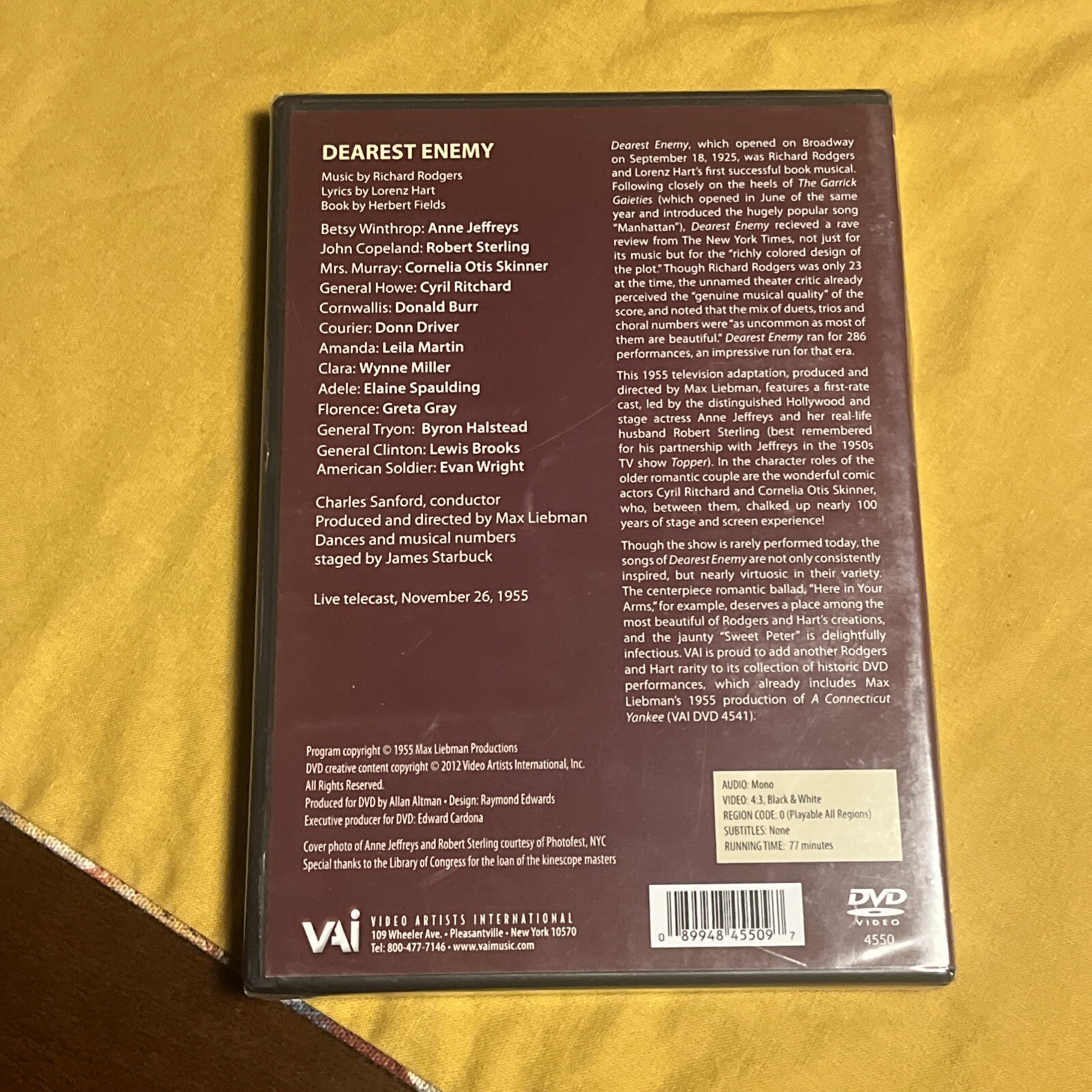 Dearest Enemy Brand New DVD Sealed. Produced by Video Artists International The product is a DVD of the 1955 classical musical "Dearest Enemy," produced and directed by Max Liebman. Starring Anne Jeffreys and Robert Sterling, this music video features a concert/performance of Rodgers & Hart's work. With a runtime of 77 minutes, this out-of-print DVD is a rare find for fans of classical music and musical theater. The DVD is released by Video Artists Int'l, offering a unique viewing experience of this timeless production.