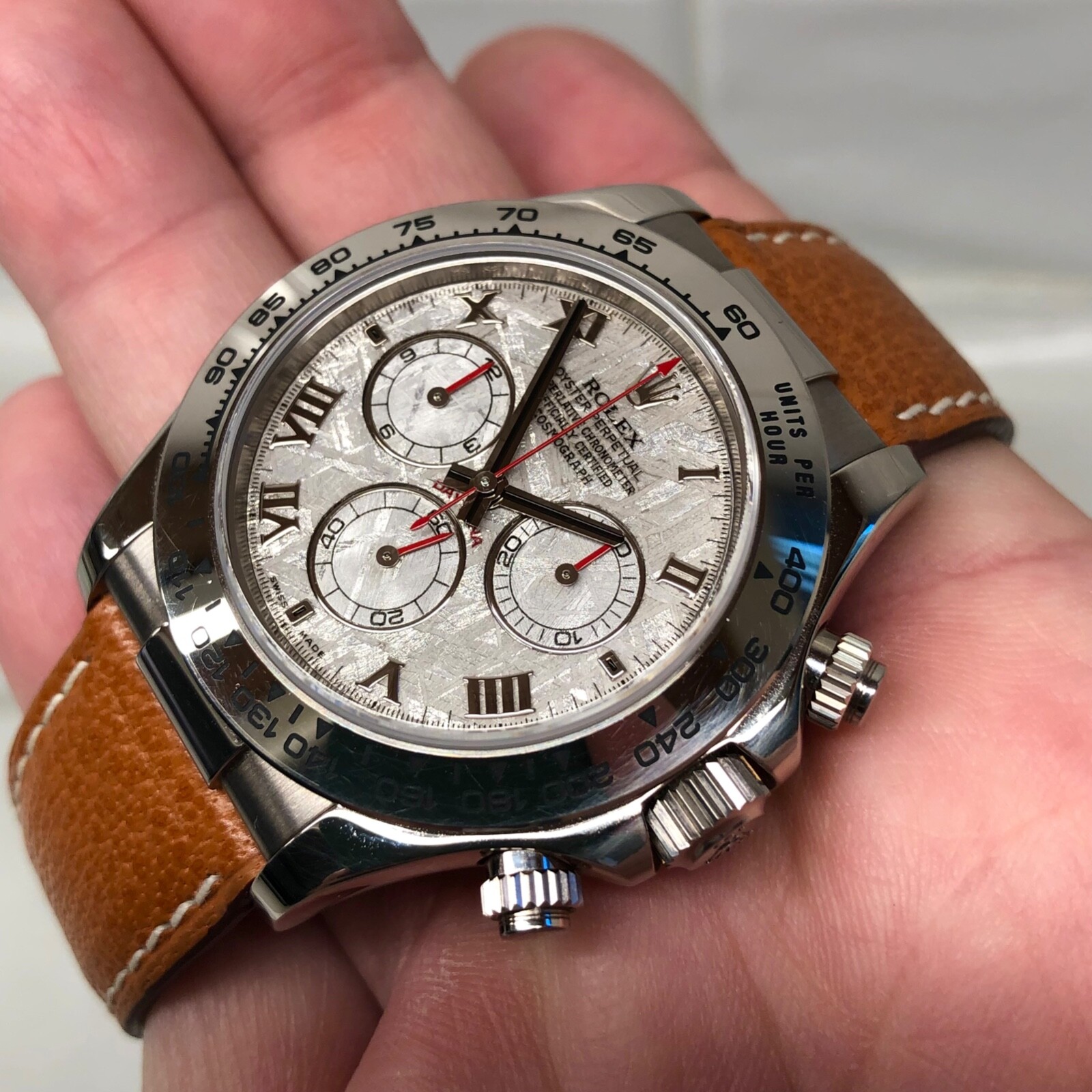 This watch is absolutely stunning! The meteorite dial gives it a unique, one-of-a-kind look, and the 18K white gold case feels luxurious yet understated. The automatic movement keeps perfect time, and the leather strap is super comfortable. It comes with all the original boxes and papers, so you know it's legit. Perfect for collectors or anyone who appreciates high-end craftsmanship. Definitely worth every penny—a true statement piece!
