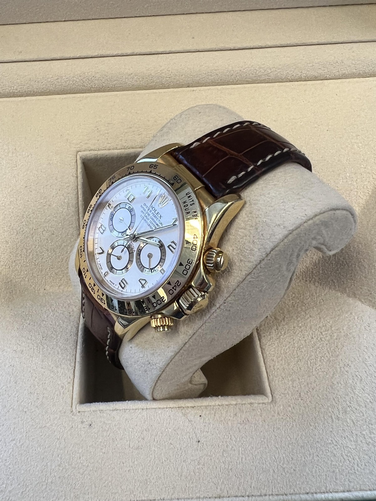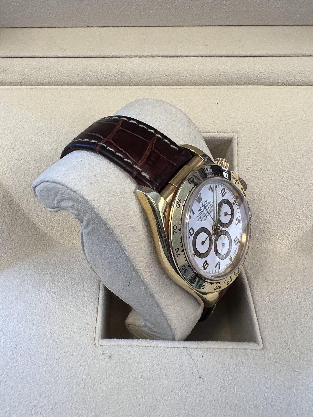 BRAND: Rolex MODEL: Daytona REFERENCE: 16518 SIZE: 40mm CASE: 18k Yellow Gold DIAL: Black BEZEL: 18k Yellow Gold BAND: Brown alligator MOVEMENT: Automatic Good condition No box or papers Accommodated with an up-to-date digital appraisal once purchased, upon request. Please contact us with any questions. Thank you. Item Number WM2254