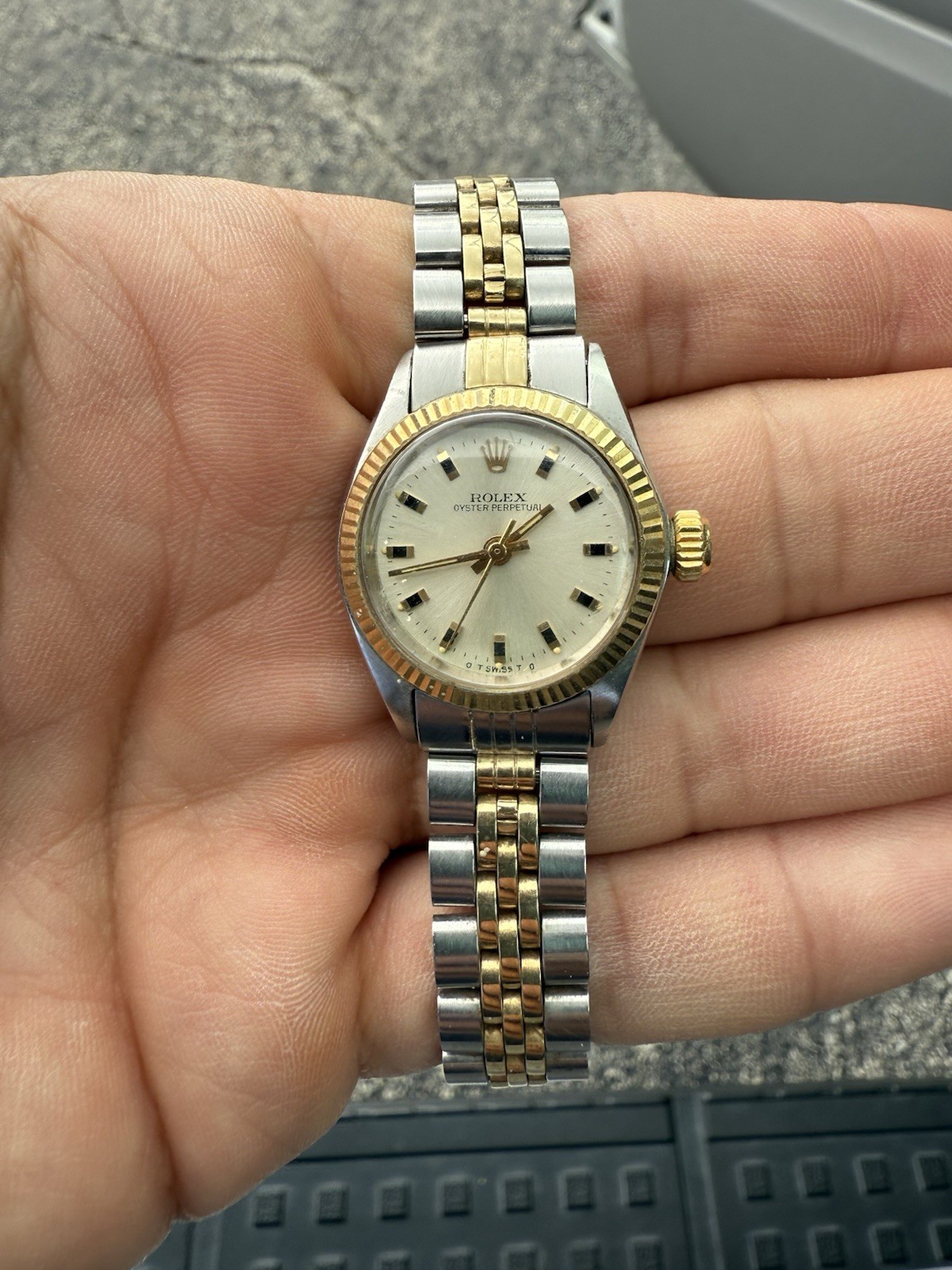 Rolex Oyster Perpetual Ladies two toned watch 14k/stainless steel on aftermarket Jubilee bracelet.