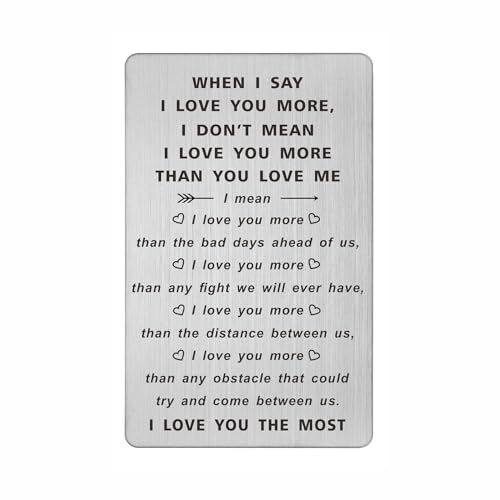 Return Policy Fast Delivery Trusted seller When I Say I Love You More Wallet Card, I Love You Gifts for Him Her, Anniversary Cards Gift for Men Husband, Sentimental Long Distance Presents, Valentines Day Gifts, Mens Stocking Stuffers Product Description Anniversary Gifts for Men - Sweet day gifts for him her. Just put this token in his wallet, he will know how much you love and proud of him. Love note for men boyfriend husband wife I Love You Mens Stocking Stuffers - Made with Stainless Steel, laser engraved keepsake with permanent love notes, cute and lightweight, will not tarnish or change color, will not easy bend within wallet Credit Card Size - Approximately credit card size 3.38"x2.13"x0.03", fits perfectly in any wallet, could always be with your love. Come with a nice paper envelope, lovely and ready for gifts giving I Love You More - WHEN I SAY I LOVE YOU MORE, I DON'T MEAN I LOVE YOU MORE THAN YOU LOVE ME. I mean I love you more than the bad days ahead of us, I love you more than any we will ever have, I love you more than the distance between us, I love you more than any obstacle that could try and come between us Love Note Card - Birthday gifts for husband boyfriend, wedding anniversary engagement valentins fathers day mothers day thanksgiving halloween christmas and any other special moment or just because Shipping Returns Payment Shipping Shipping is FREE to all addresses other than APO/PO boxes in the lower 48 states. All our stock ships from US-based warehouses. Shipped via USPS or UPS (depending on location and package weight) Unless stated otherwise, all orders will ship within 24-72 hours of your payment being processed. Check our feedback to see the great reviews of FAST shipping we offer. Returns Seller does not accept returns Payment We currently accept payment via eBay managed payments only. Once payment is cleared, we will dispatch your shipment within 1-3 business days. Please refer to the "Shipping" tab for more information regarding shipping speed to your destination.