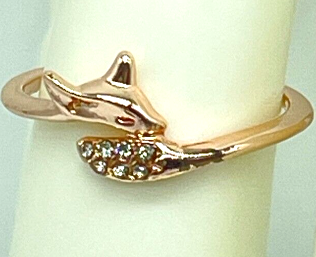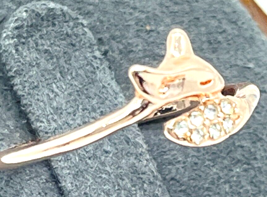 This beautiful ring features a thin delicate band in rose gold tone with clear crystals on the tail. The animal-shaped ring is designed like a fox, making it a perfect addition to any occasion. The ring is a size 8 and has a unique setting style that adds to its beauty. The main stone color is crystal, and the metal is rose gold tone. This band is perfect for those who love animals and beauty. Bin 309