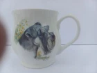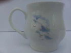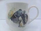 Rosewood China Schnauzer tea cup Made in Staffordshire England Fine Bone China Image on front shows a Schnauzer dog and yellow flowers with green stems and leaves. The back image is 4 small birds flying in blue and white clouds. Cup has a scalloped puffy shape to it. No Chips or cracks. LR