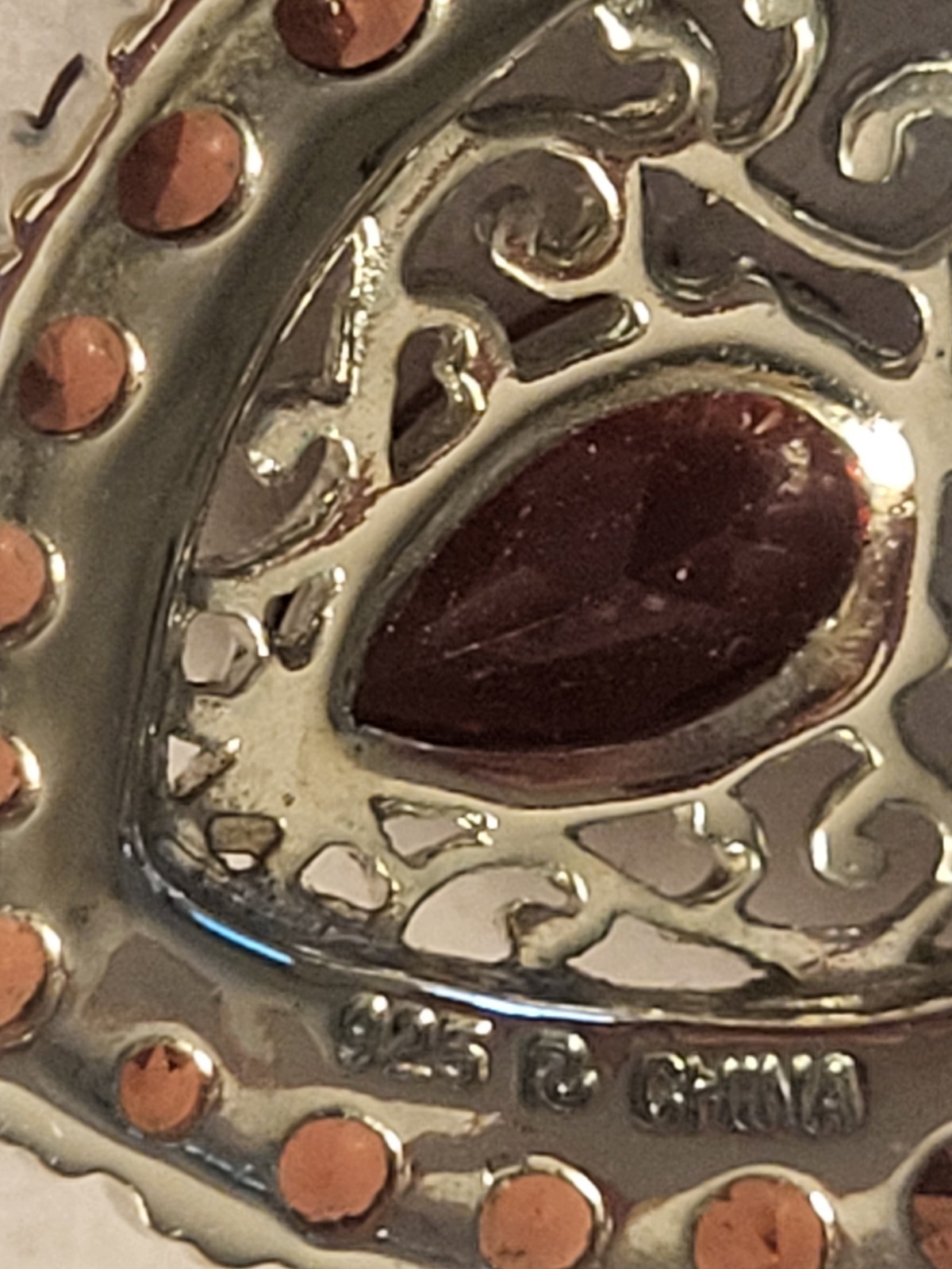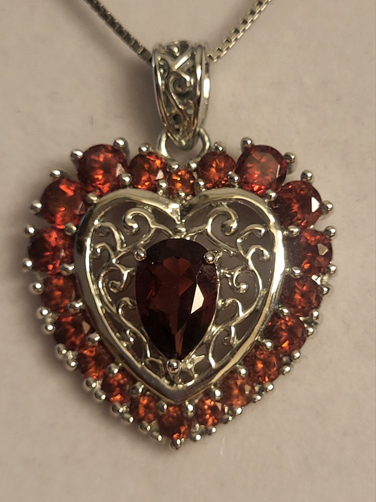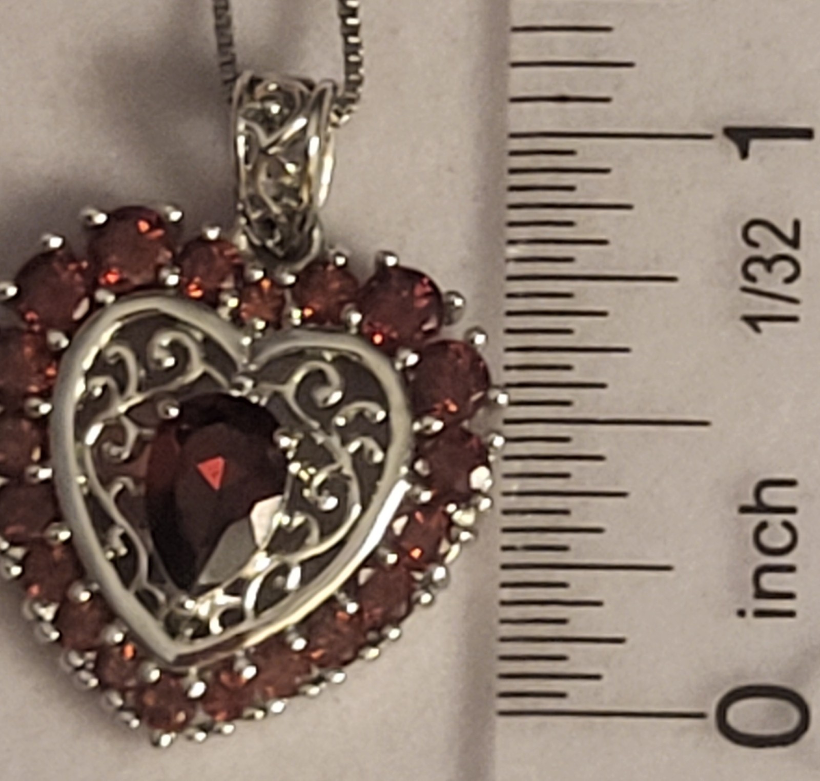 This Ross Simons Filigree Garnet Heart Pendant & Italian 925 Necklace is a beautiful and elegant piece of fine jewelry. The pendant features a heart-shaped garnet stone in a prong setting on an 18" sterling silver chain with a spring ring closure. The red color and oval shape of the garnet stone make it a perfect choice for special occasions like Mother's Day, Christmas, anniversary, birthday, or Valentine's Day. This pendant embodies the theme of love and is a perfect gift for a special someone. This lovely piece is pre-loved and deserves to be shown off. ❤️