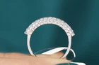 This stunning moissanite wedding band is absolutely breathtaking! The three rows of pave-set stones sparkle like crazy, catching light from every angle. The round-cut moissanites have incredible fire and brilliance, rivaling diamonds at a fraction of the cost. The craftsmanship is top-notch—it feels substantial yet comfortable for daily wear. I love that it's ethically made without compromising on luxury. The band looks way more expensive than it is, perfect for stacking or wearing solo. After months of wear, it still looks brand new with zero stones loosening. Highly recommend for anyone wanting show-stopping sparkle responsibly!